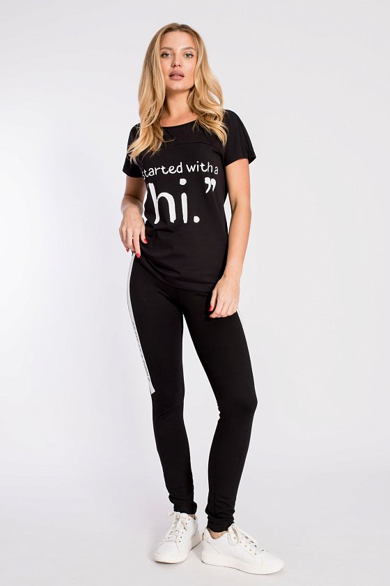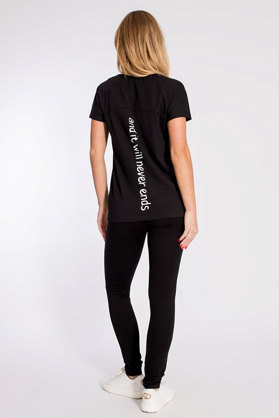 Футболка с цельнокроеным рукавом из полотна х/б с лайкрой. Горловина обработана бейкой. Низ изделия и рукавов подшиты плоским эластичным стежком. Спереди и сзади расположены принты.
