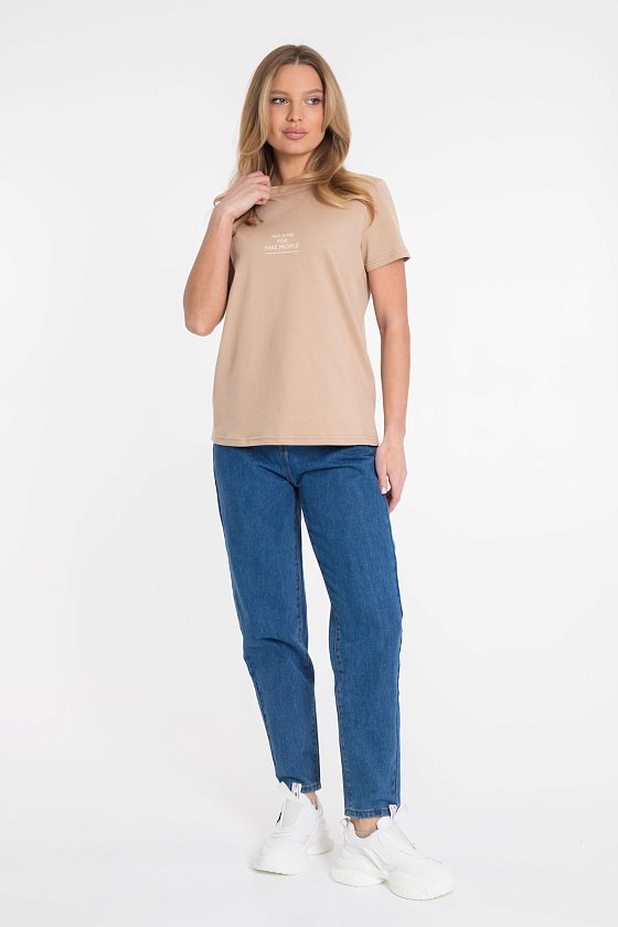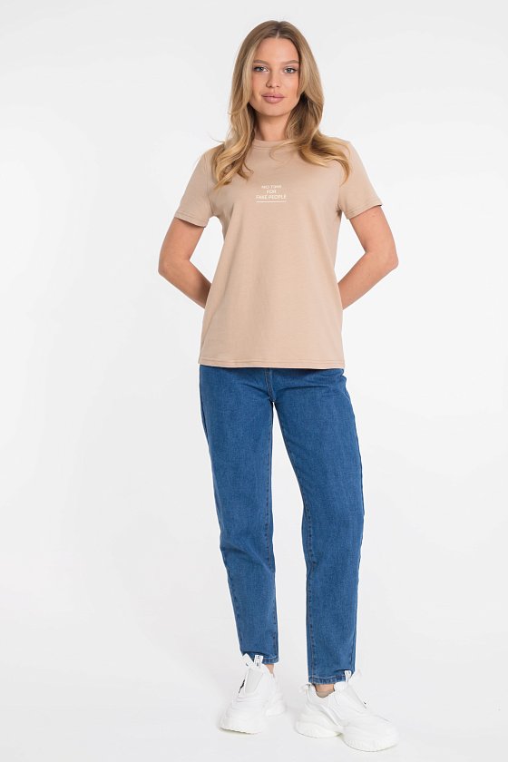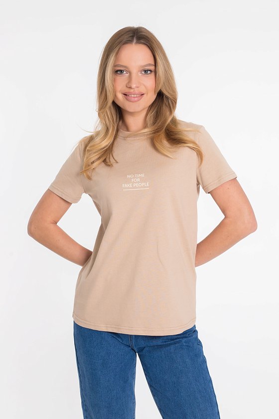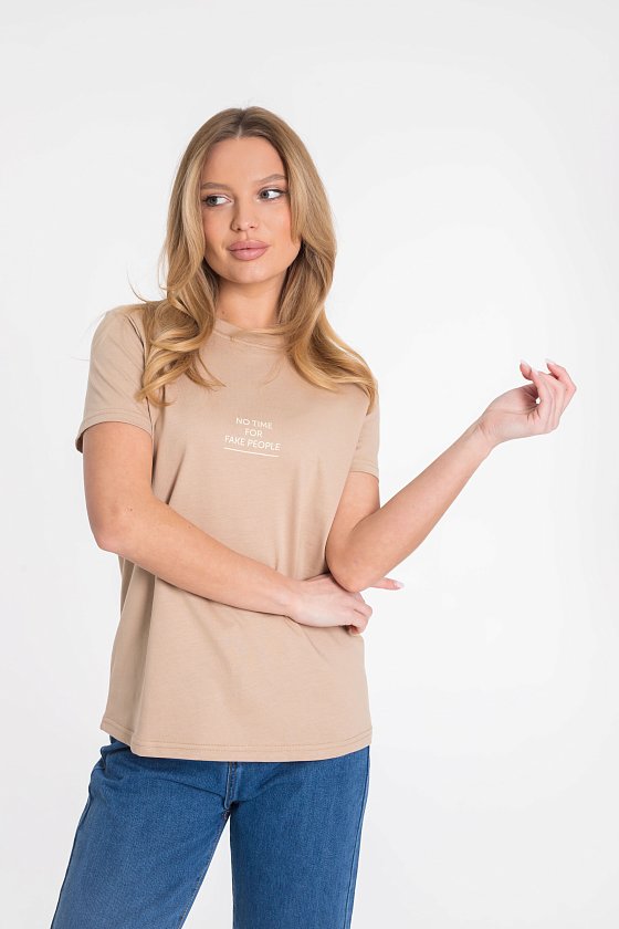 Футболка из однотонной кулирки с коротким втачным рукавом, на полочке принт.