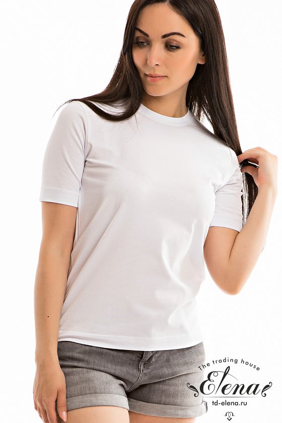 Женская футболка выполнена из однотонной кулирки с лайкрой. С коротким рукавом и круглым вырезом горловины, оформленным планкой.