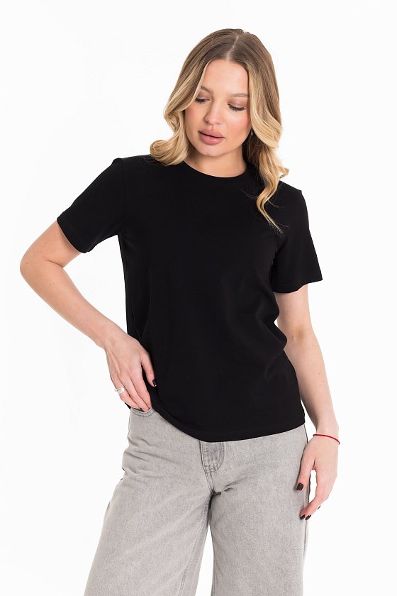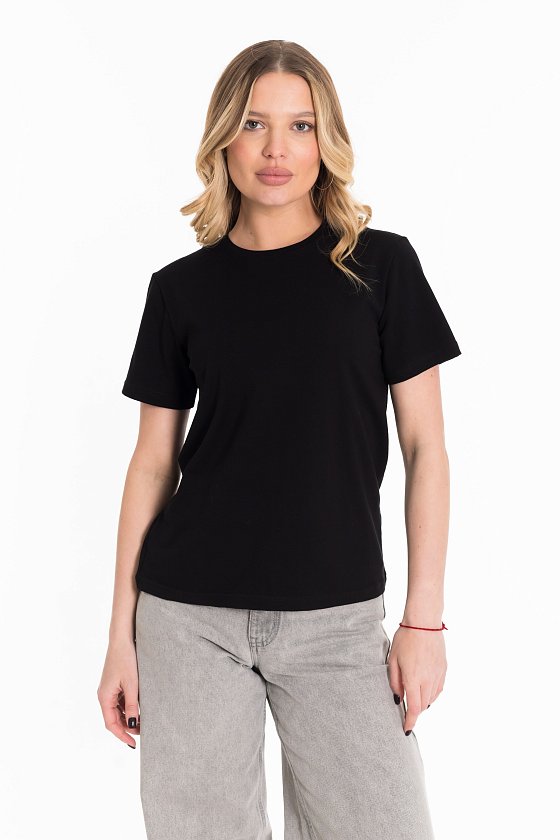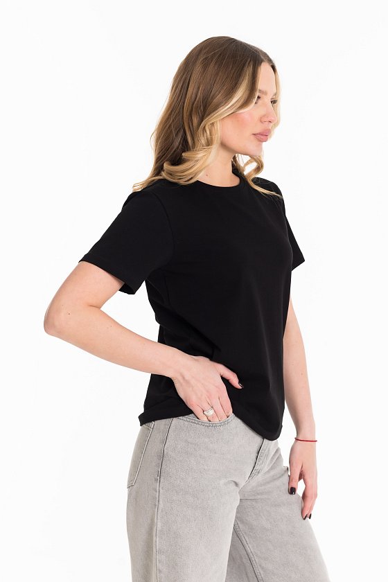 Женская футболка изготовлена из хлопкового полотна с добавлением лайкры, что обеспечивает комфорт и хорошую воздухопроницаемость. Футболка имеет короткий втачной рукав и круглый вырез горловины, что придает ей классический стильный вид. Такая модель базового черного цвета отлично сочетается с джинсами, брюками или юбкой. Изготовленная из натуральной ткани, футболка обеспечит комфорт в течение всего дня.