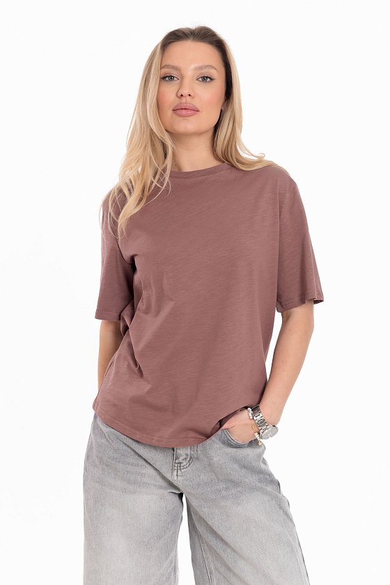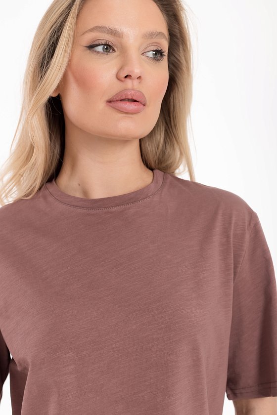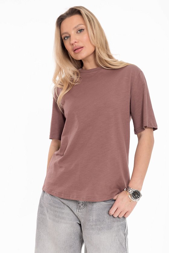 Женская футболка изготовлена из хлопкового полотна - кулирка "фламли", что обеспечивает комфорт и хорошую воздухопроницаемость. Футболка имеет короткий рукав и круглый вырез горловины, что придает ей классический стильный вид. Такая модель футболки отлично сочетается с джинсами, брюками или юбкой. Изготовленная из натуральной ткани, футболка обеспечит комфорт в течение всего дня.