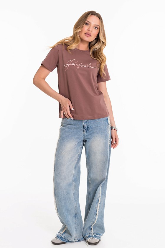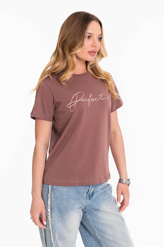 Футболка выполнена из однотонной кулирки с лайкрой. С коротким втачным рукавом и притачной планкой по круглому вырезу горловины. Спереди нанесён принт.