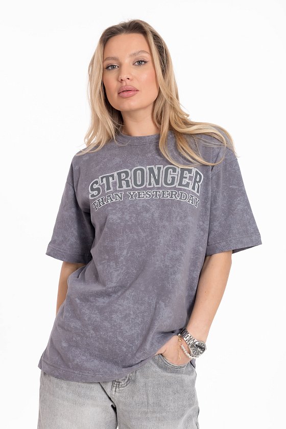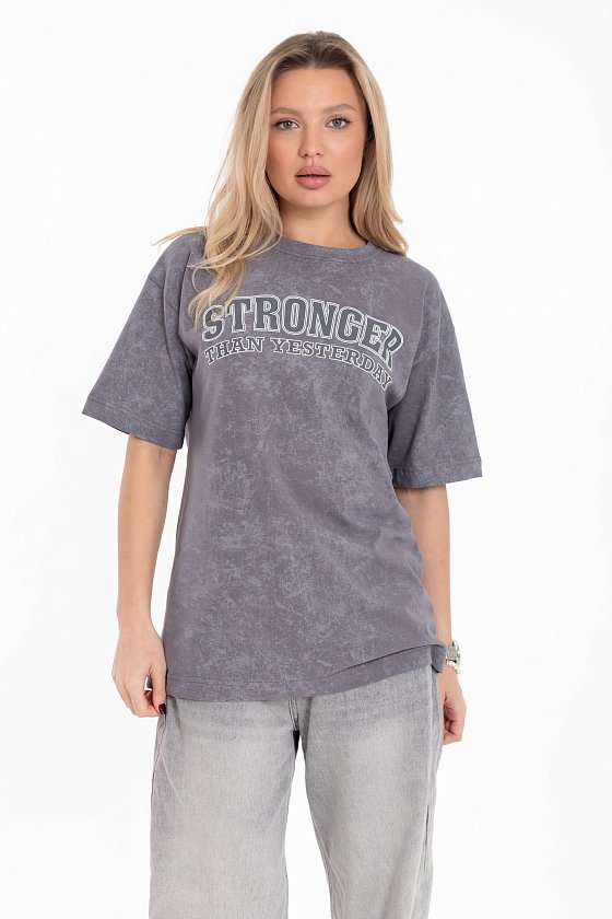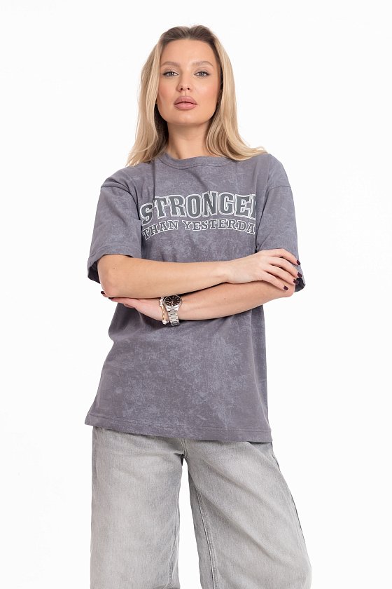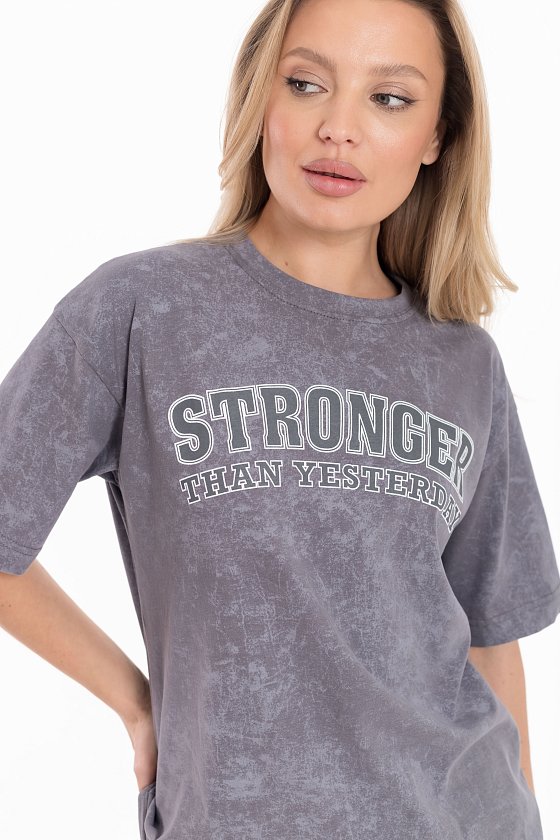 Женская футболка из лёгкой и приятной к телу ткани — отличный выбор для повседневного гардероба. Изготовлена из кулирки серого цвета, имеет свободный силуэт и круглый вырез горловины. Принт спереди добавляет изделию оригинальность. Футболка идеально подойдёт для отдыха или домашней носки.