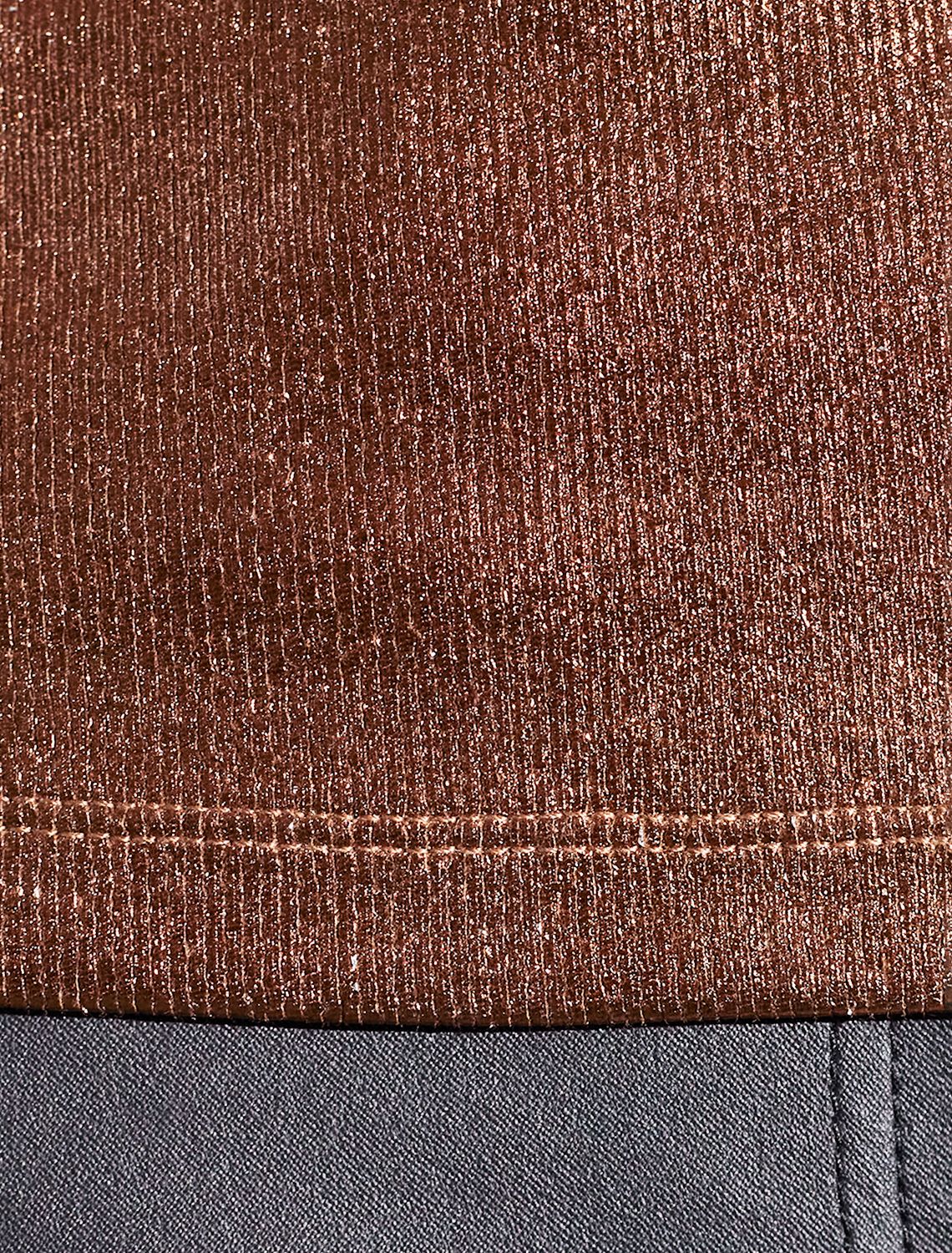 Стильная футболка кофейного цвета с V вырезом выполнена из премиального хлопка с добавлением эластана. Эффектное матовое бронзовое покрытие металлик с серебристыми вкраплениями придает футболке изысканный блеск. Чуть удлиненные рукава и глубокий вырез, открывающий область декольте, добавляют женственность и элегантность образу. Мелкий рубчик визуально вытягивает силуэт, за счет эластана в составе материал прекрасно тянется и садится на любую фигуру, в том числе большие размеры. Ткань износостойкая, сохраняет свой превоначальный вид даже после многочисленных стирок, отличается мягкостью и приятными тактильными ощущениями, такой материал не раздражает кожу, дарит ощущение уюта даже при длительном ношении, а воздухопроницаемость позволяет коже свободно дышать.