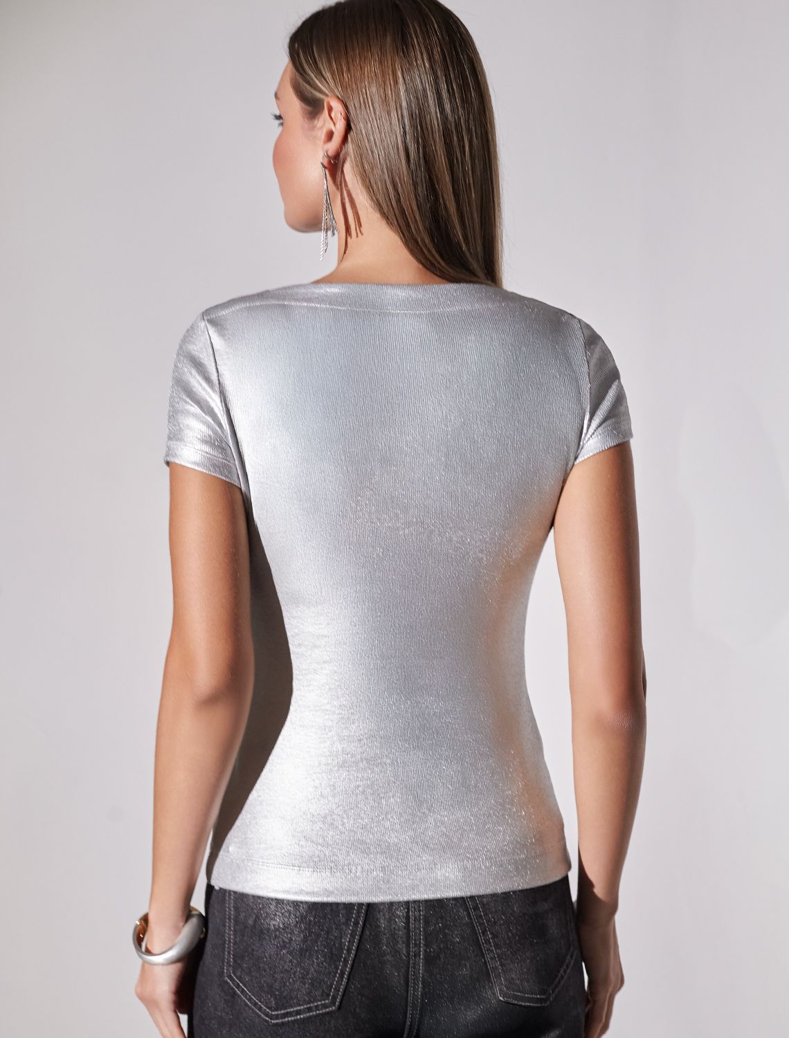 Повседневная футболка универсальна: она сочетается с джинсами, юбками или строгими брюками — легко создать как деловой образ для офиса, так и наряд для вечеринки или ужина вне дома. Матовое покрытие создает благородный блеск без лишней яркости, благодаря чему футболка смотрится свежо и актуально.
