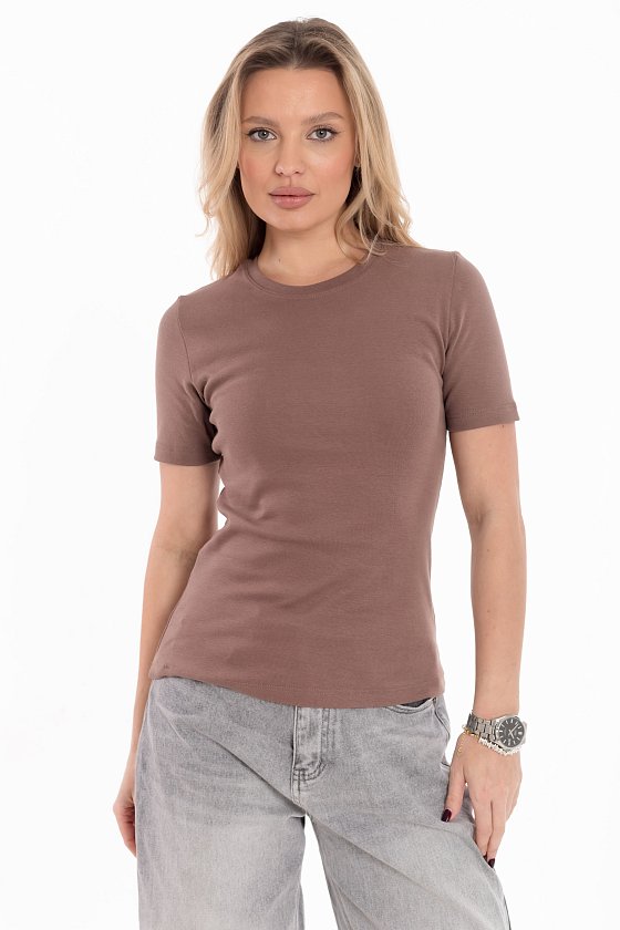 Женская футболка выполнена из однотонной рибаны. Модель прилегающего силуэта с круглым вырезом горловины подчёркивает фигуру, а короткий втачной рукав делает образ лаконичным и универсальным. Футболка отлично подойдёт для повседневной носки и легко сочетается с различными элементами гардероба.