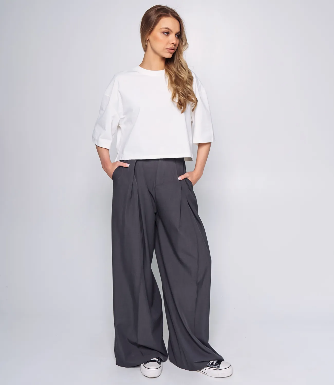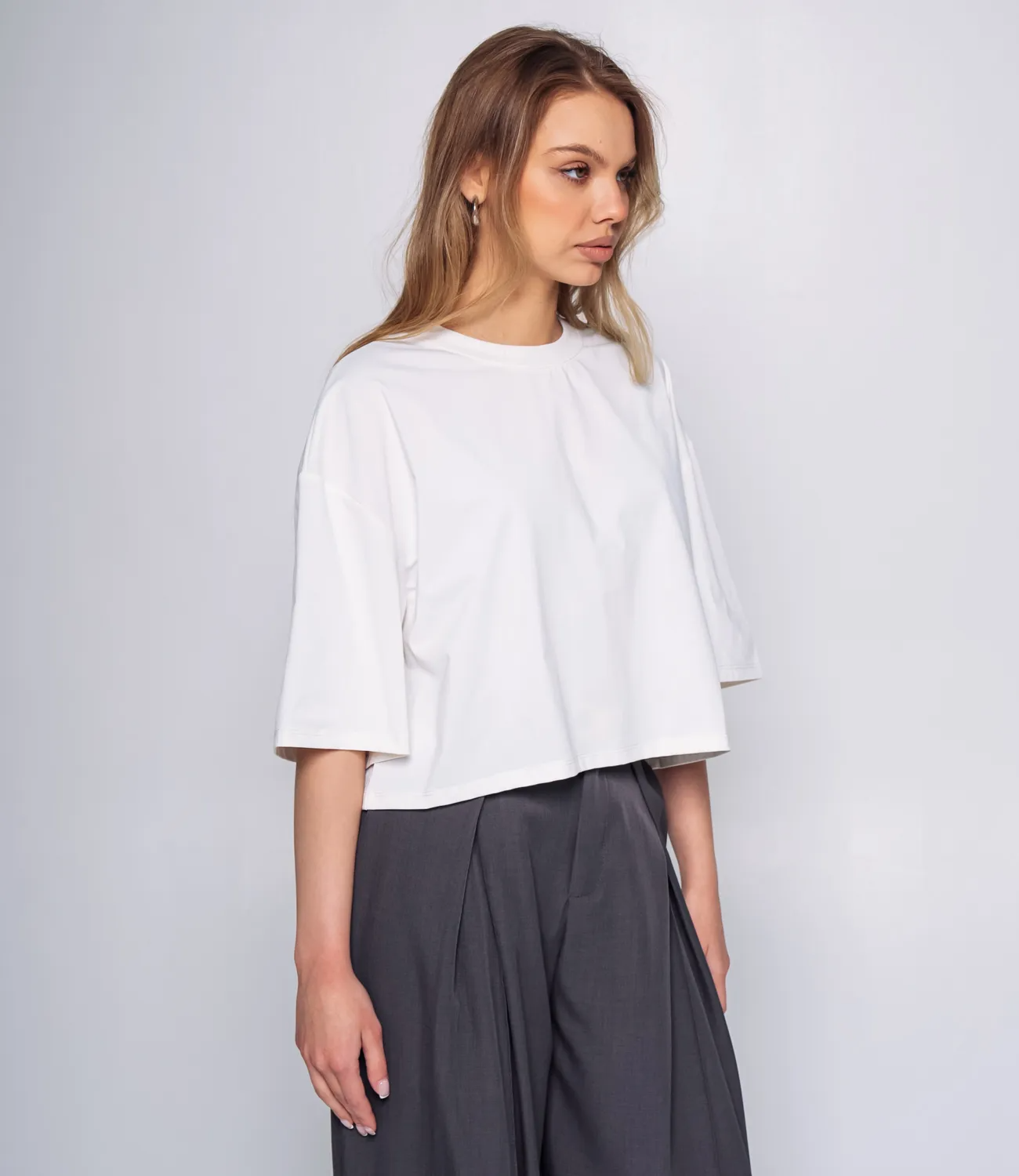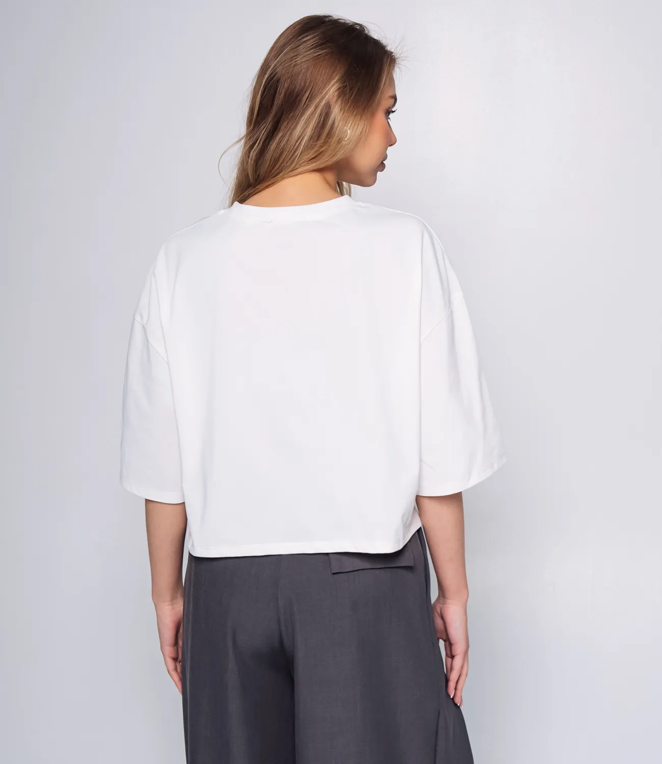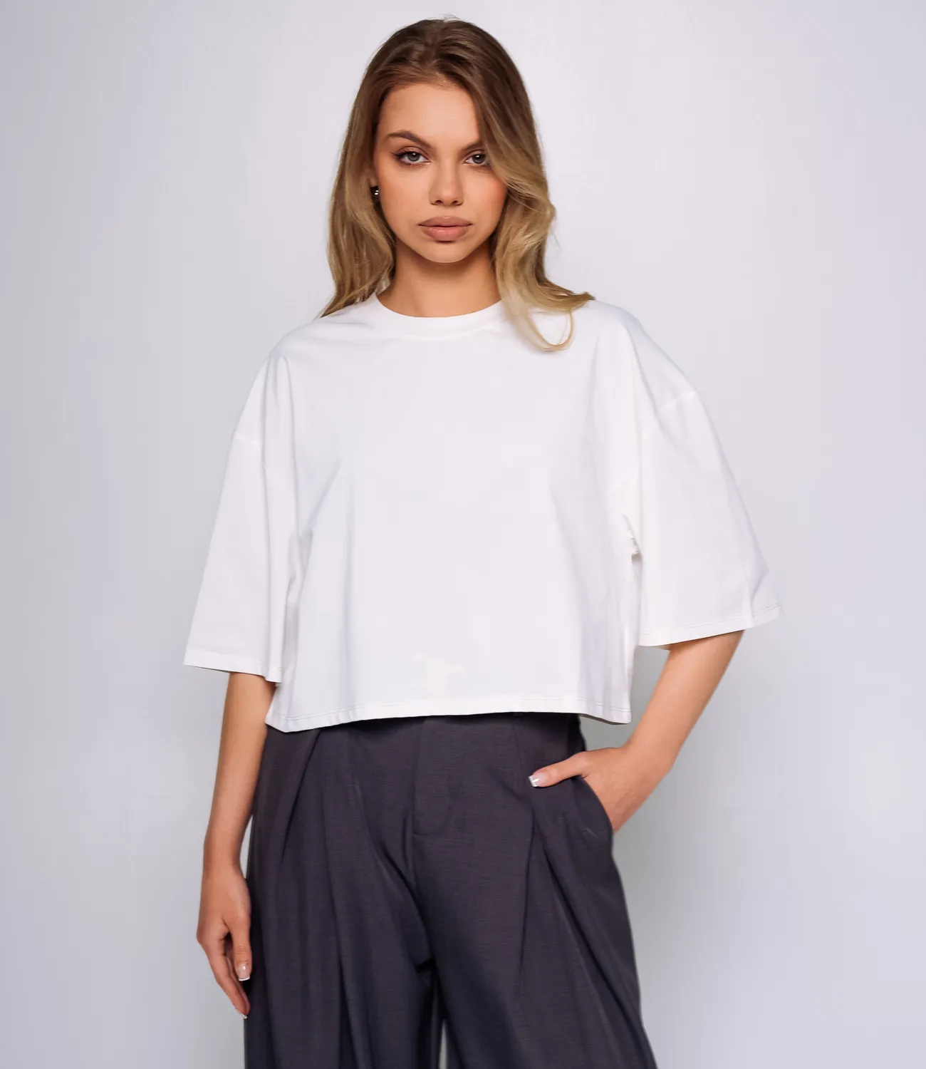 Футболка выполнена в нежном нейтральном цвете, что делает ее идеальным выбором для разнообразных стильных комбинаций. С просторным силуэтом и короткими рукавами, она обеспечивает комфорт и свободу движений в течение всего дня. Круглый вырез на горловине и укороченная длина придают нейтральной модели стильный и современный вид, который легко вписывается в любой гардероб. Изготовленная на 100% из качественного полиэстера, футболка обладает превосходными дышащими свойствами и приятна к телу, что делает ее идеальным вариантом для повседневной носки в любое время года. Она великолепно сочетается как с брюками, так и с юбками, создавая расслабленный и модный образ для любых случаев – будь то прогулка с друзьями или встреча в кафе. Обратите внимание на легкость ухода за этим изделием: благодаря высококачественному материалу, футболка не теряет своего первоначального вида после стирки и сохраняет яркость цвета. На сайте представлена таблица размеров, которая позволит вашим покупательницам точно подобрать нужный вариант, чтобы не сомневаться в своем выборе. Не упустите возможность предложить своим клиенткам эту прекрасную футболку по доступной цене. Она станет обязательной частью любого гардероба и позволит каждой женщине чувствовать себя стильной и уверенной каждый день. Подарите своим покупательницам возможность быть модными и комфортными с этой футболкой! Рост модели: 168, параметры: 89-63-90.