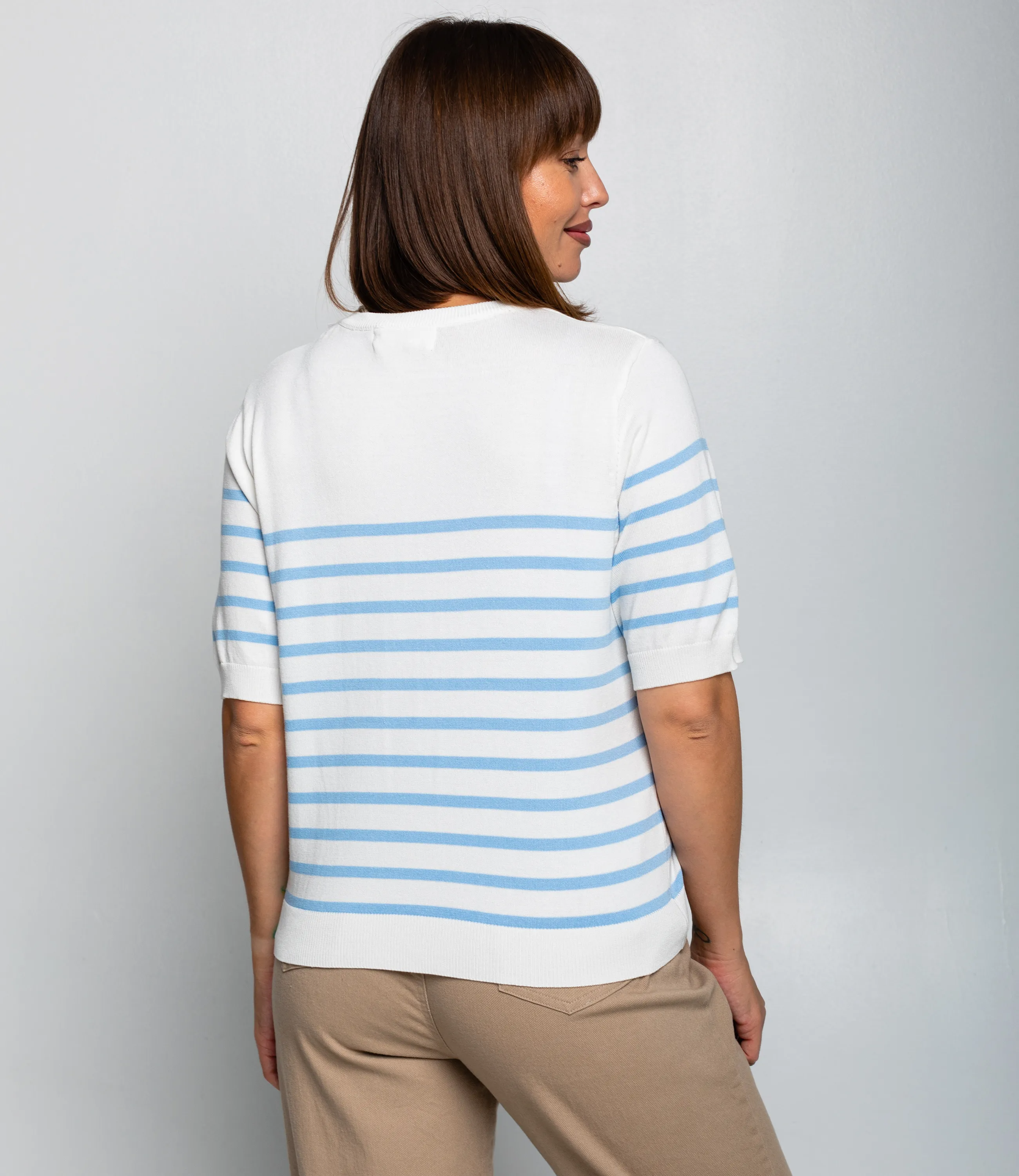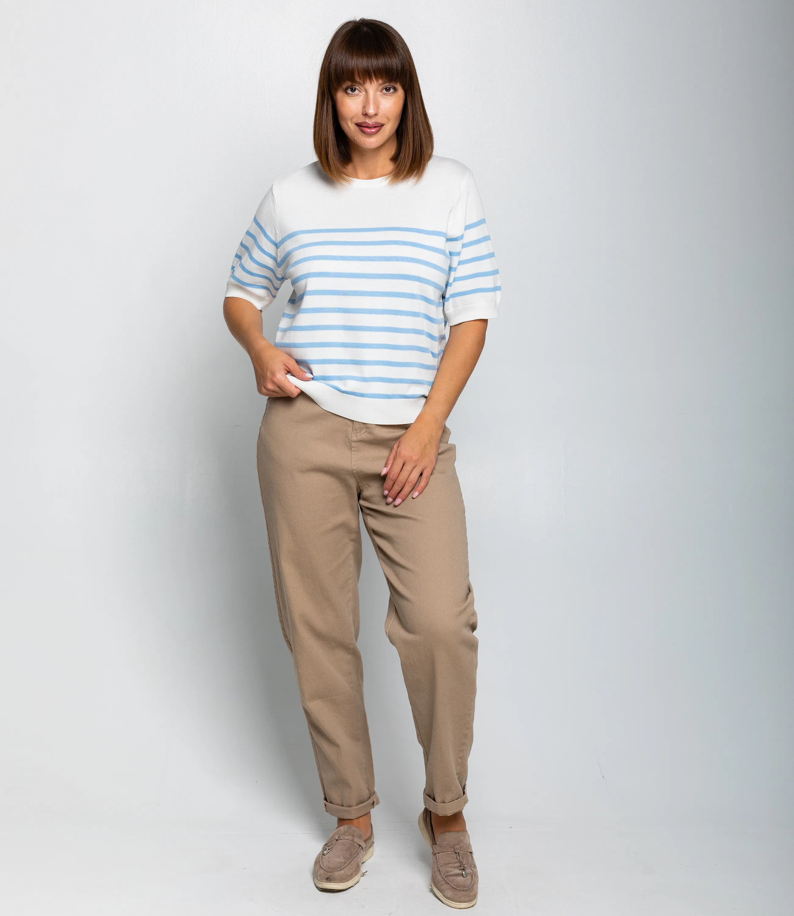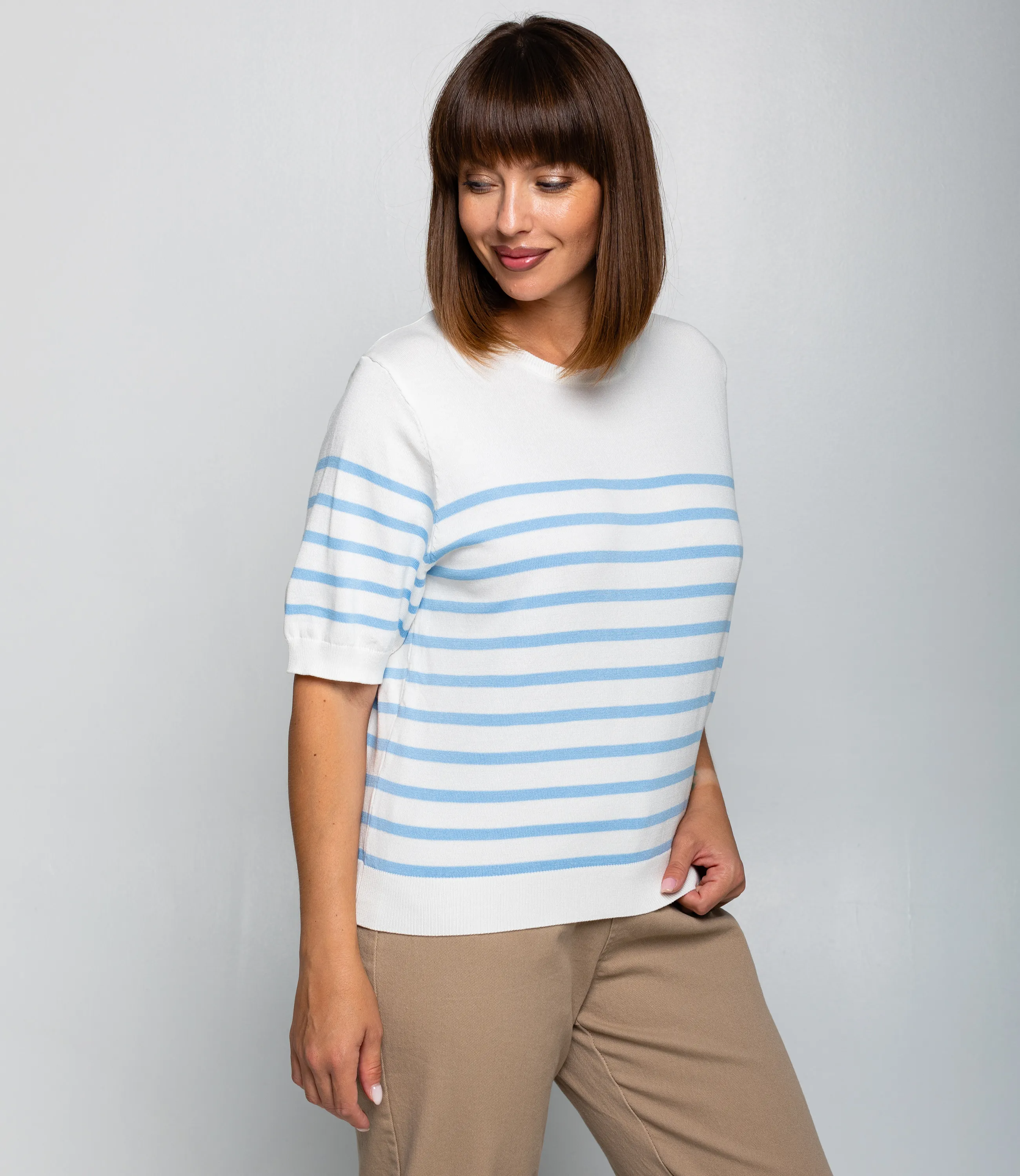 Эта футболка — прекрасный выбор для вашего магазина, предлагая стильный и универсальный дизайн, который станет отличным дополнением к гардеробу ваших клиентов. Футболка выполнена в полосатой морской стилистике: основа с поперечными полосами одинаковой ширины, верхняя часть плеч и горловина однотонные, полосы начинаются чуть ниже линии плеч. Вырез горловины круглый, невысокий, с аккуратной трикотажной планкой. Рукава короткие, доходят до середины предплечья, с широкой манжетой, на которой рисунок полос продолжается. Фасон свободный, слегка укороченный, линия низа заканчивается выше талии и оформлена плотной трикотажной резинкой для лёгкой сборки. Выполненная из 90% акрила, 10% шерсти, футболка обеспечивает отличное качество и приятные тактильные ощущения. Независимо от сезона, она станет любимым элементом в гардеробе ваших клиентов. На странице сайта доступна таблица размеров, что позволит вашим покупателям легко найти подходящий вариант. Установленная цена делает эту футболку доступной для широкой аудитории, что обеспечит вам высокий уровень продаж.