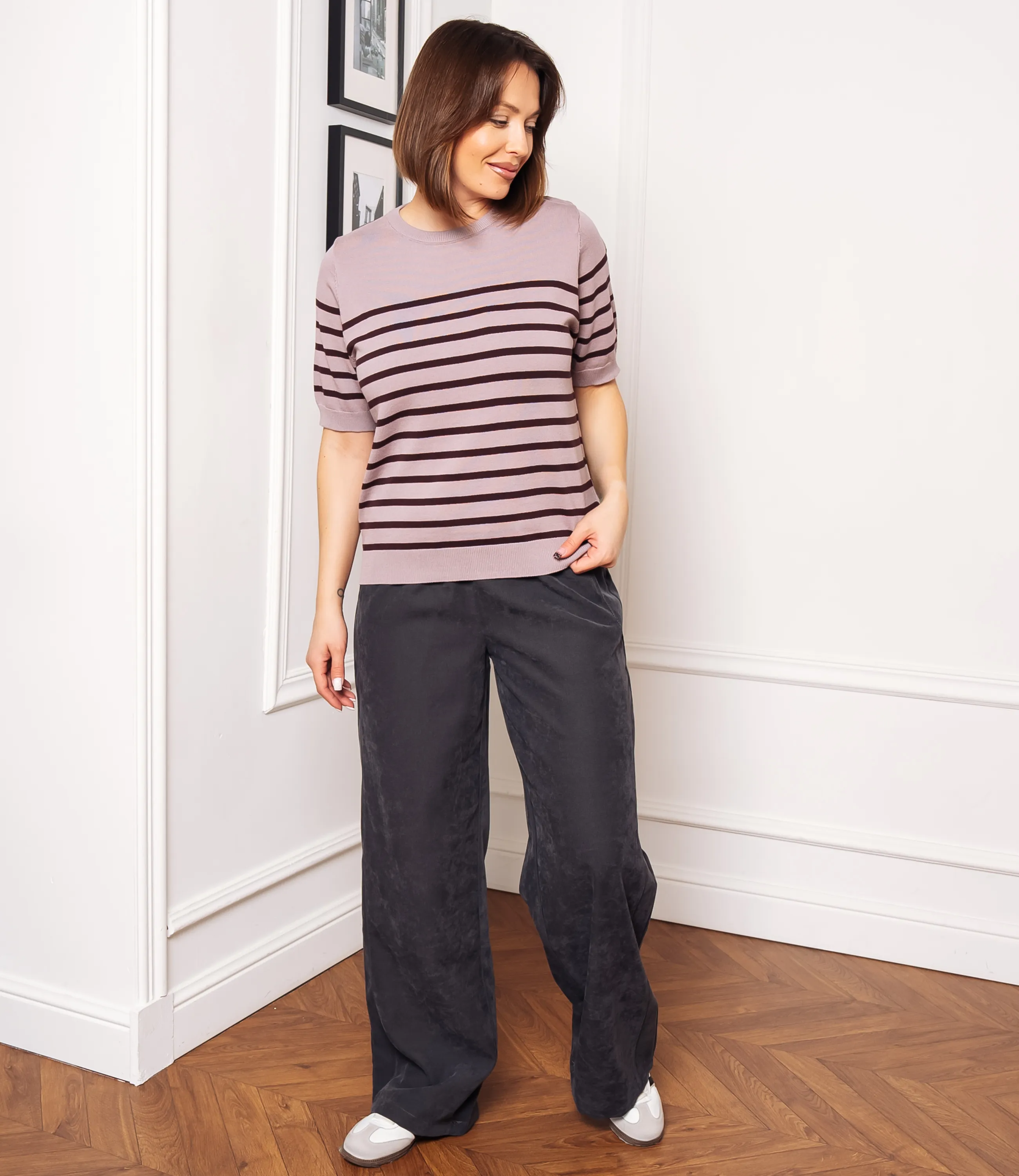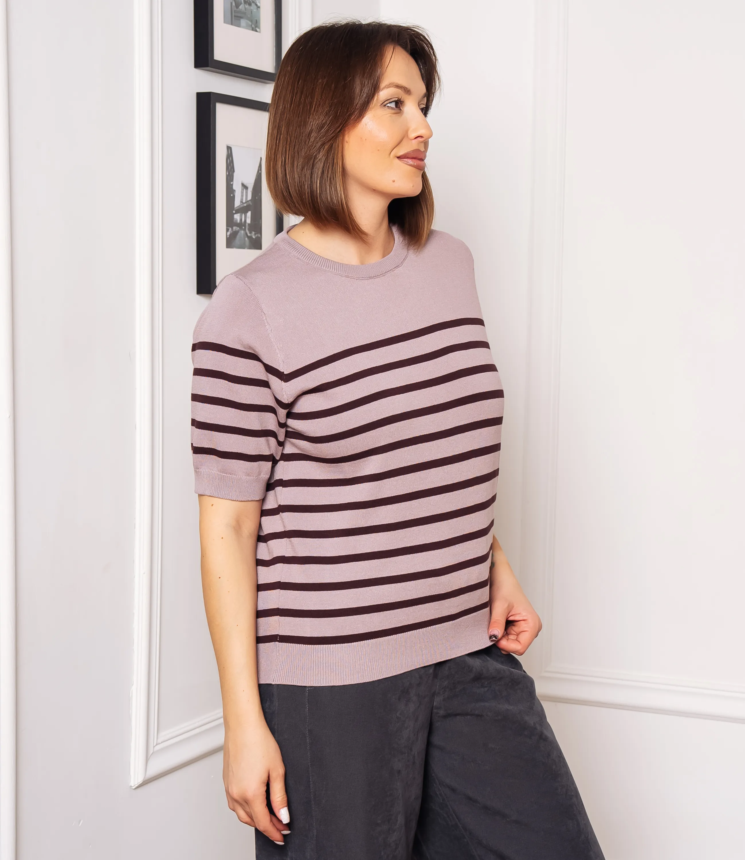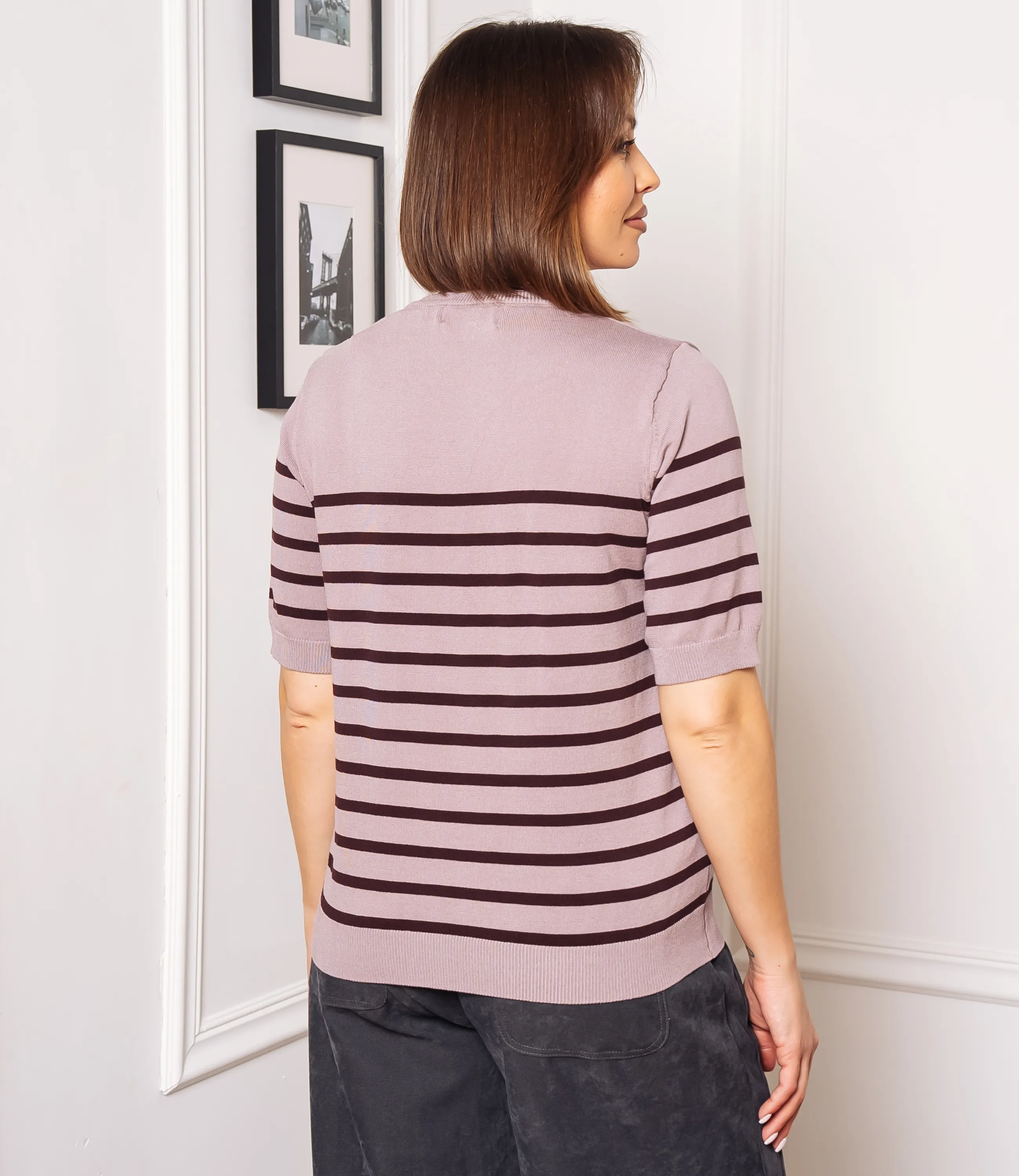 Эта футболка — прекрасный выбор для вашего магазина, предлагая стильный и универсальный дизайн, который станет отличным дополнением к гардеробу ваших клиентов. Футболка выполнена в полосатой морской стилистике: основа с поперечными полосами одинаковой ширины, верхняя часть плеч и горловина однотонные, полосы начинаются чуть ниже линии плеч. Вырез горловины круглый, невысокий, с аккуратной трикотажной планкой. Рукава короткие, доходят до середины предплечья, с широкой манжетой, на которой рисунок полос продолжается. Фасон свободный, слегка укороченный, линия низа заканчивается выше талии и оформлена плотной трикотажной резинкой для лёгкой сборки. Выполненная из 90% акрила, 10% шерсти, футболка обеспечивает отличное качество и приятные тактильные ощущения. Независимо от сезона, она станет любимым элементом в гардеробе ваших клиентов. На странице сайта доступна таблица размеров, что позволит вашим покупателям легко найти подходящий вариант. Установленная цена делает эту футболку доступной для широкой аудитории, что обеспечит вам высокий уровень продаж.
