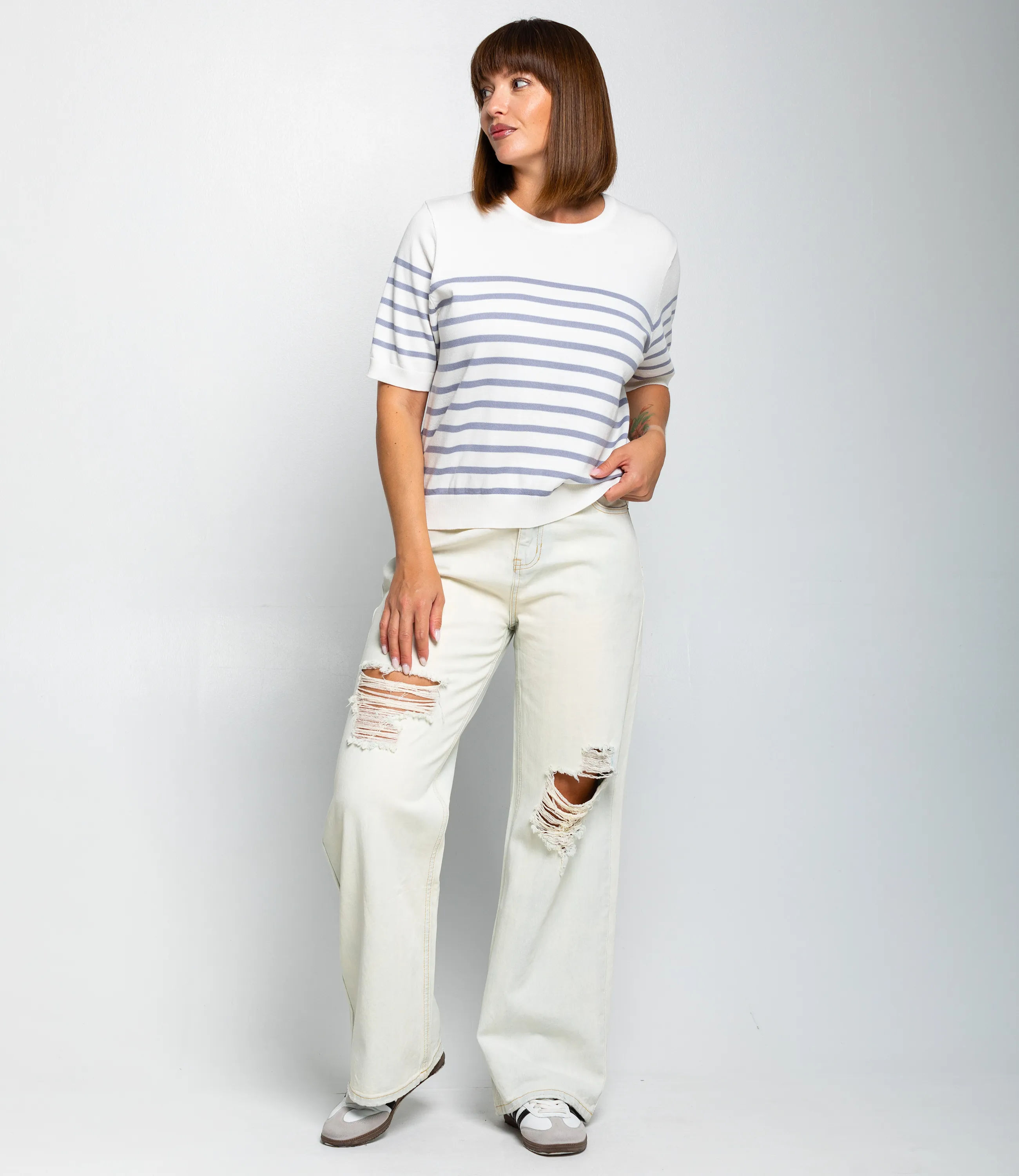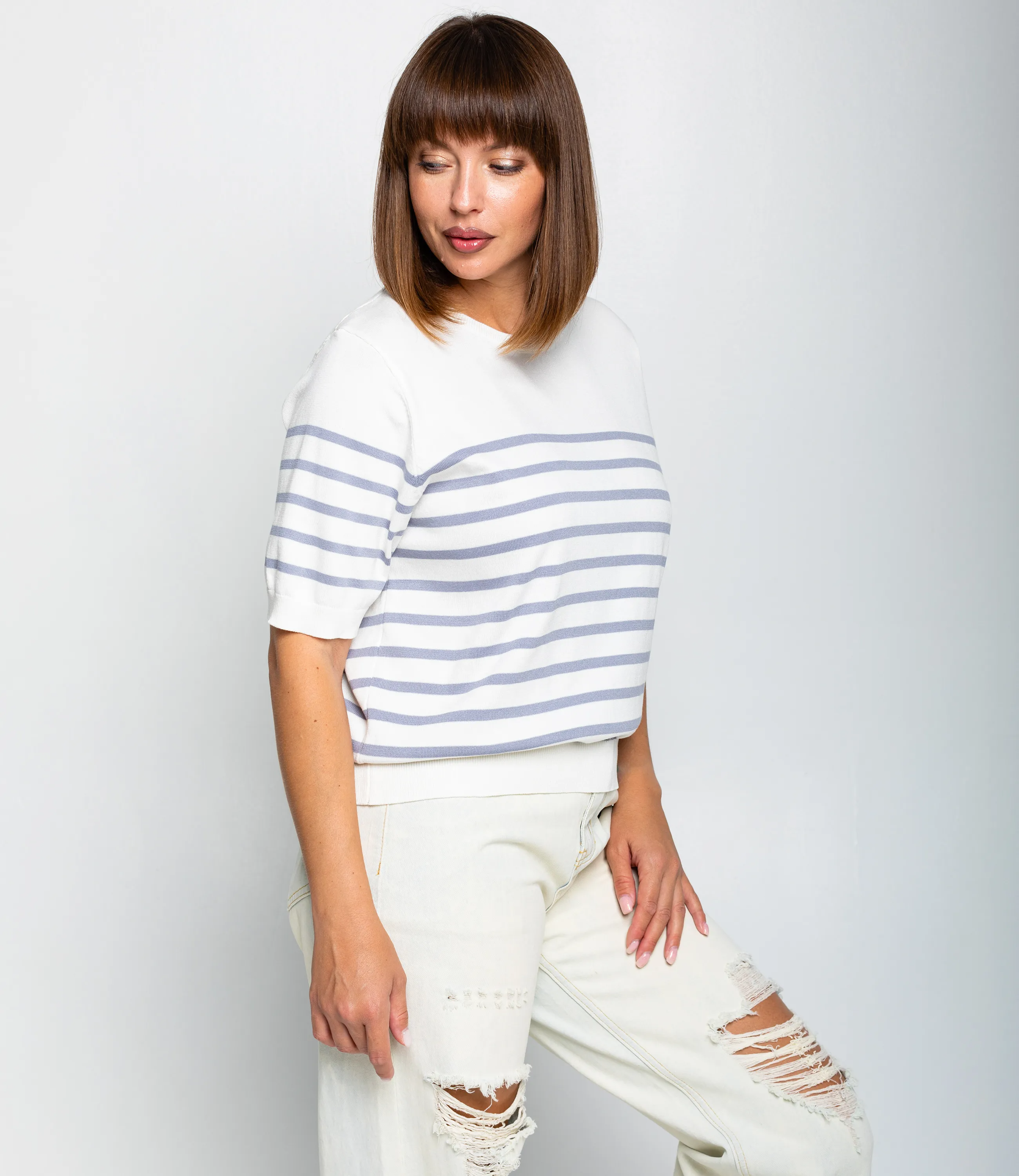 Эта футболка — прекрасный выбор для вашего магазина, предлагая стильный и универсальный дизайн, который станет отличным дополнением к гардеробу ваших клиентов. Футболка выполнена в полосатой морской стилистике: основа с поперечными полосами одинаковой ширины, верхняя часть плеч и горловина однотонные, полосы начинаются чуть ниже линии плеч. Вырез горловины круглый, невысокий, с аккуратной трикотажной планкой. Рукава короткие, доходят до середины предплечья, с широкой манжетой, на которой рисунок полос продолжается. Фасон свободный, слегка укороченный, линия низа заканчивается выше талии и оформлена плотной трикотажной резинкой для лёгкой сборки. Выполненная из 90% акрила, 10% шерсти, футболка обеспечивает отличное качество и приятные тактильные ощущения. Независимо от сезона, она станет любимым элементом в гардеробе ваших клиентов. На странице сайта доступна таблица размеров, что позволит вашим покупателям легко найти подходящий вариант. Установленная цена делает эту футболку доступной для широкой аудитории, что обеспечит вам высокий уровень продаж.