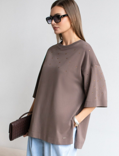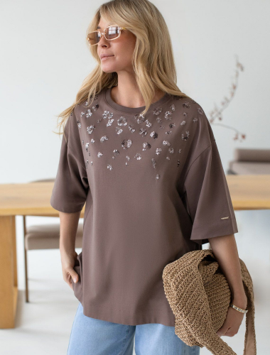 Футболка оверсайз с принтом пайетками из премиального хлопка с эластаном D49.125 кофе_пайтеки