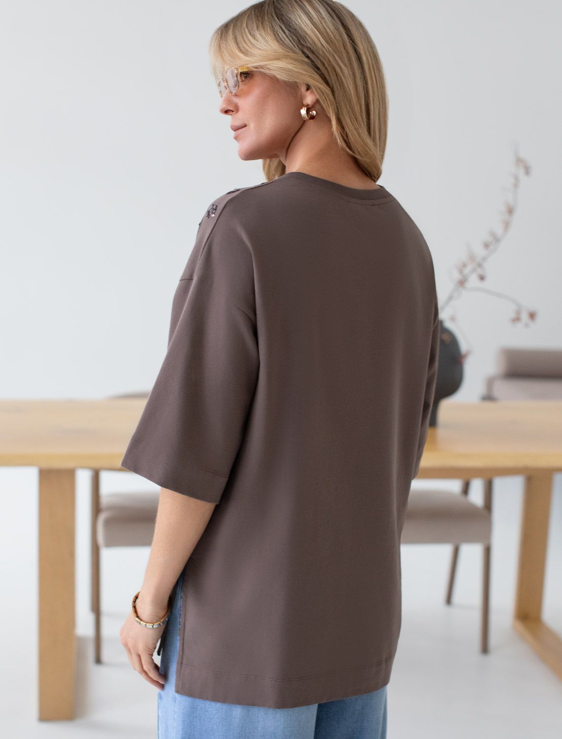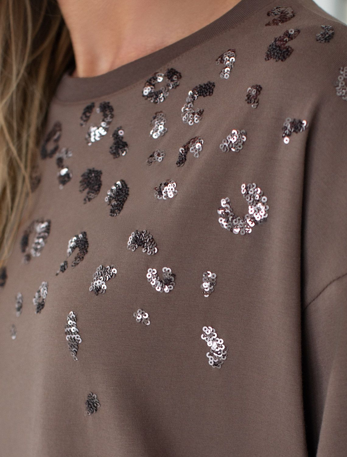 Оверсайз футболка кофейного цвета из премиального хлопка с добавлением эластана создана для комфорта и стиля каждый день. Натуральный материал приятный к телу, дышащая ткань хорошо держит форму и подходит для повседневной носки дома, в офисе или на прогулке. Классический свободный крой, удлиненный прямой силуэт и свободная посадка делают эту базовую футболку универсальным решением для любой фигуры и роста, включая плюс сайз размеры и беременных девушек, отлично скроет животик. Широкие рукава держат форму и подойдут на полные руки. Нарядная футболка украшена авторским принтом пайетками, которые создают красивый мерцающий эффект. Такой акцент делает модель уместной как для особых случаев, так и для ежедневных образов.
