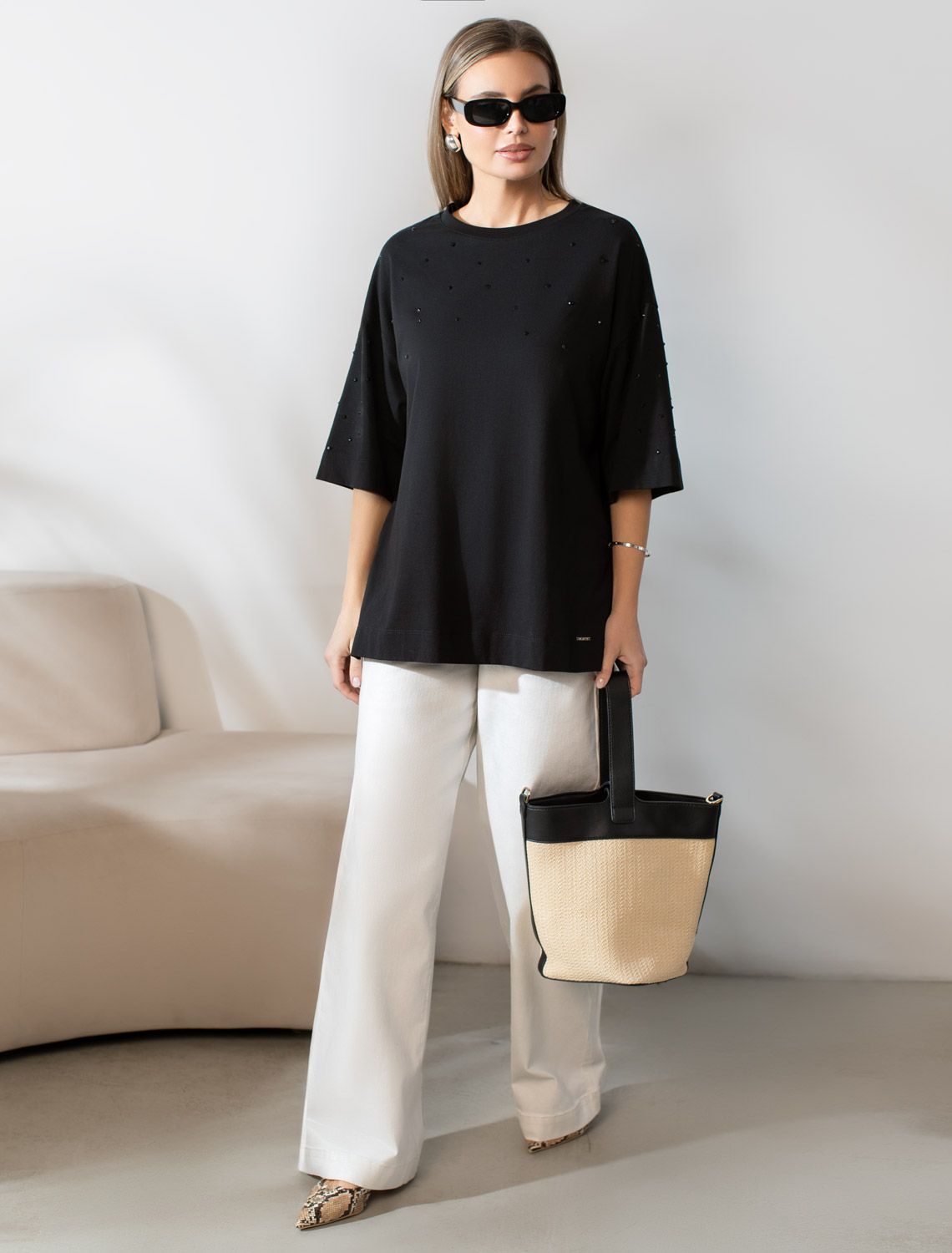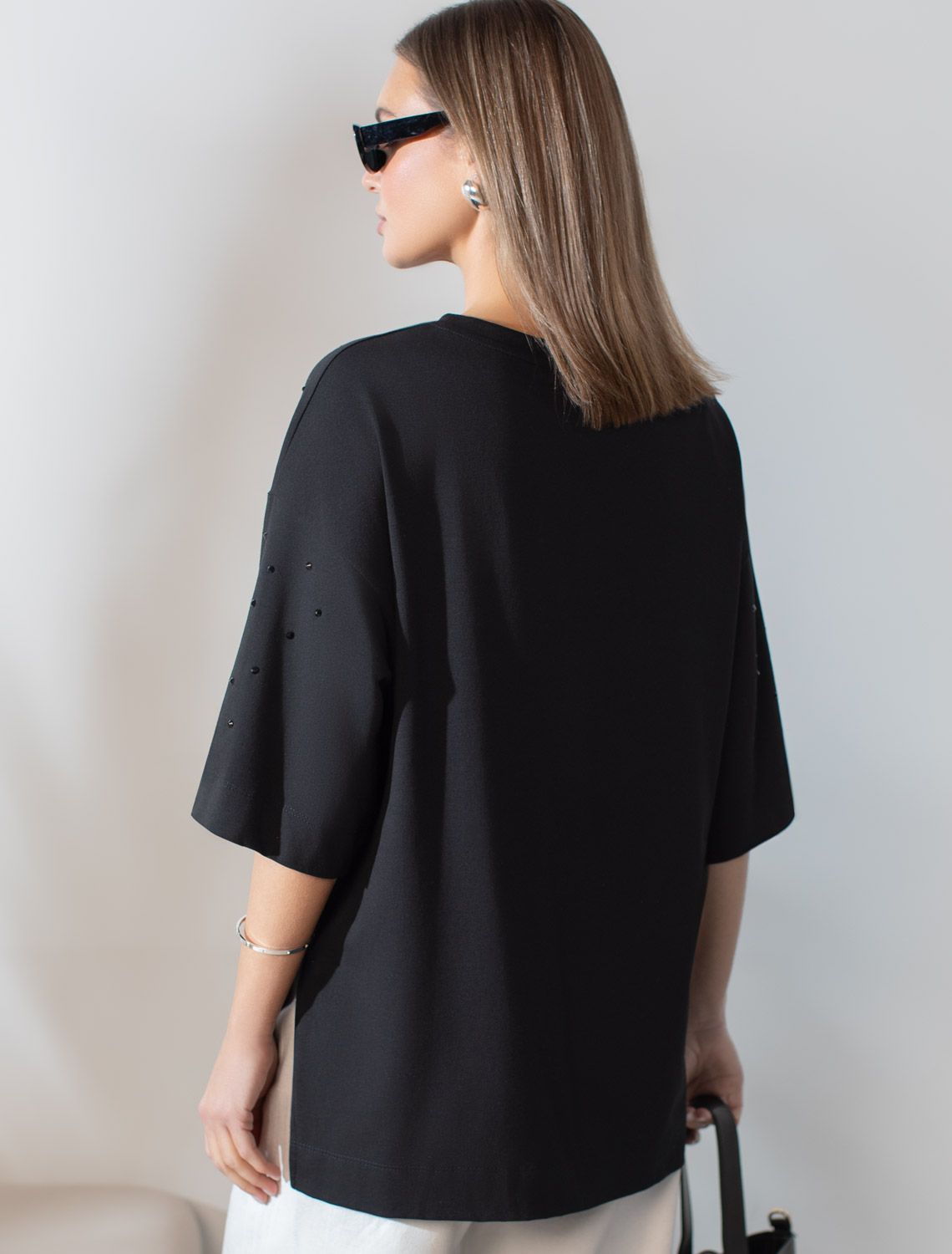 Оверсайз футболка черного цвета из премиального хлопка с добавлением эластана создана для комфорта и стиля каждый день. Натуральный материал приятный к телу, дышащая ткань хорошо держит форму и подходит для повседневной носки дома, в офисе или на прогулке. Классический свободный крой, удлиненный прямой силуэт и свободная посадка делают эту базовую футболку универсальным решением для любой фигуры и роста, включая плюс сайз размеры и беременных девушек, отлично скроет животик. Широкие рукава держат форму и подойдут на полные руки. Нарядная футболка украшена авторским принтом в виде россыпи страз в тон основного полотна, которые создают красивый мерцающий эффект. Такой акцент делает модель уместной как для особых случаев, так и для ежедневных образов.