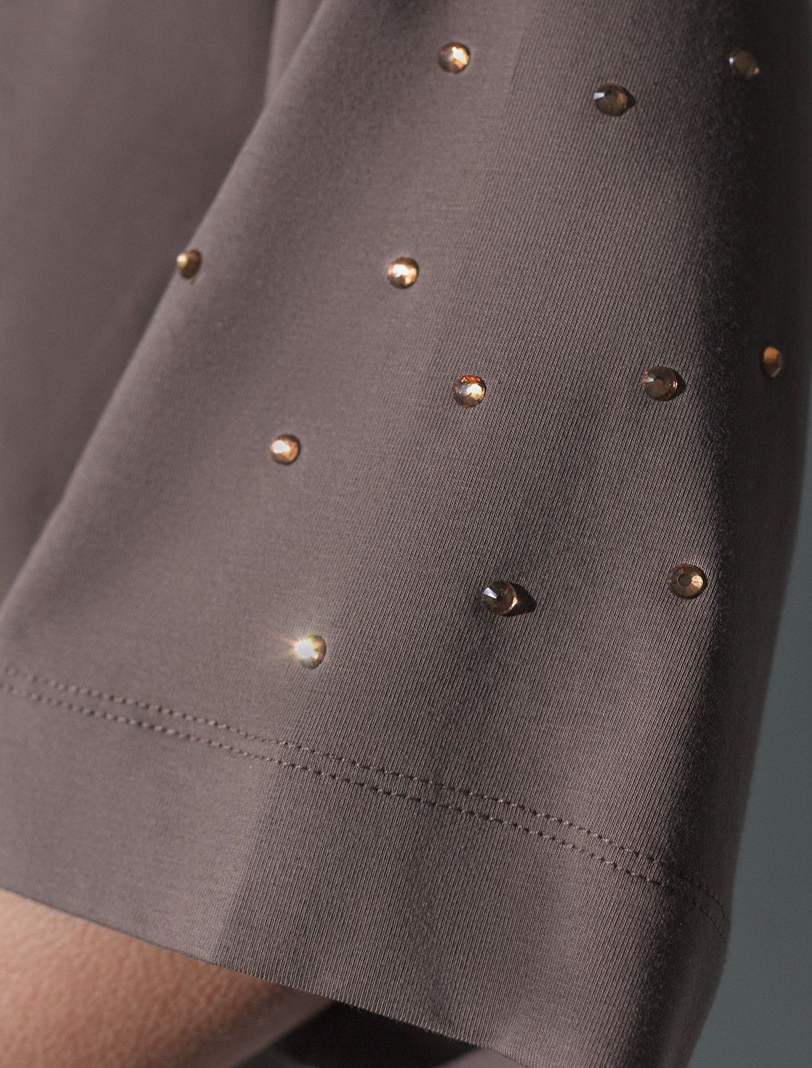 Оверсайз футболка кофейного цвета из премиального хлопка с добавлением эластана создана для комфорта и стиля каждый день. Натуральный материал приятный к телу, дышащая ткань хорошо держит форму и подходит для повседневной носки дома, в офисе или на прогулке. Классический свободный крой, удлиненный прямой силуэт и свободная посадка делают эту базовую футболку универсальным решением для любой фигуры и роста, включая плюс сайз размеры и беременных девушек, отлично скроет животик. Широкие рукава держвт форму и подойдут на полные руки. Нарядная футболка украшена авторским принтом в виде россыпи страз в тон основного полотна, которые создают красивый мерцающий эффект. Такой акцент делает модель уместной как для особых случаев, так и для ежедневных образов.