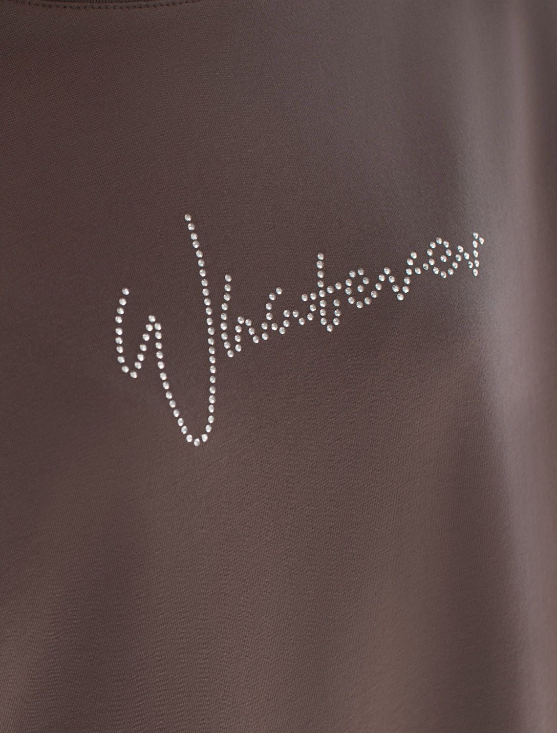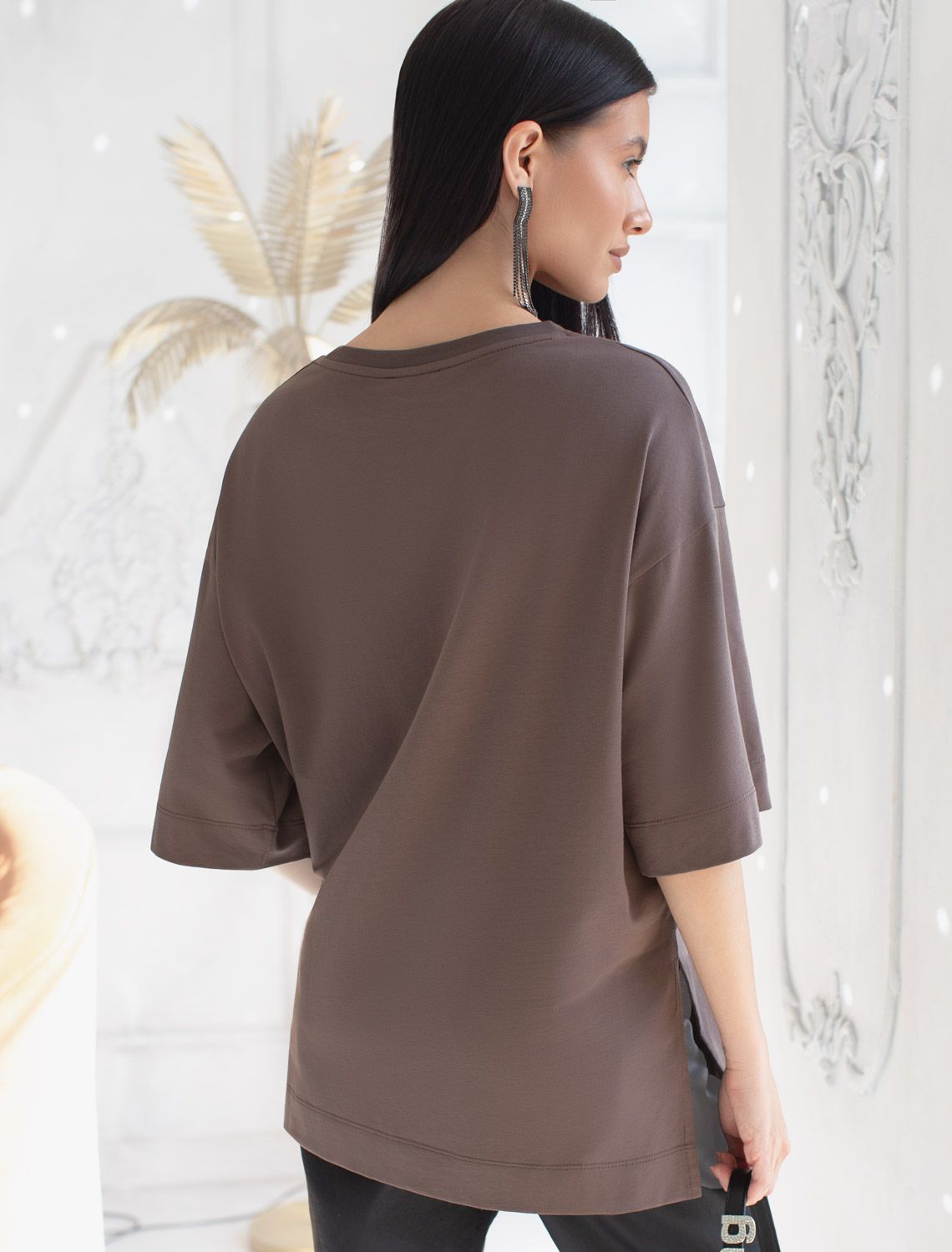 Оверсайз футболка кофейного цвета с из премиального хлопка с добавлением эластана создана для комфорта и стиля каждый день. Натуральный материал приятный к телу, дышащая ткань хорошо держит форму и подходит для повседневной носки дома, в офисе или на прогулке. Классический свободный крой, удлиненный прямой силуэт и свободная посадка делают эту базовую футболку универсальным решением для любой фигуры и роста, включая плюс сайз размеры и беременных девушек, отлично скроет животик. Широкие рукава держат форму и подойдут на полные руки. Нарядная футболка украшена авторским принтом в виде надписи блестящими стразами, которые создают красивый мерцающий эффект. Перевод надписи Whatever - Что бы ни... Такой акцент делает модель уместной как для особых случаев, так и для ежедневных образов.