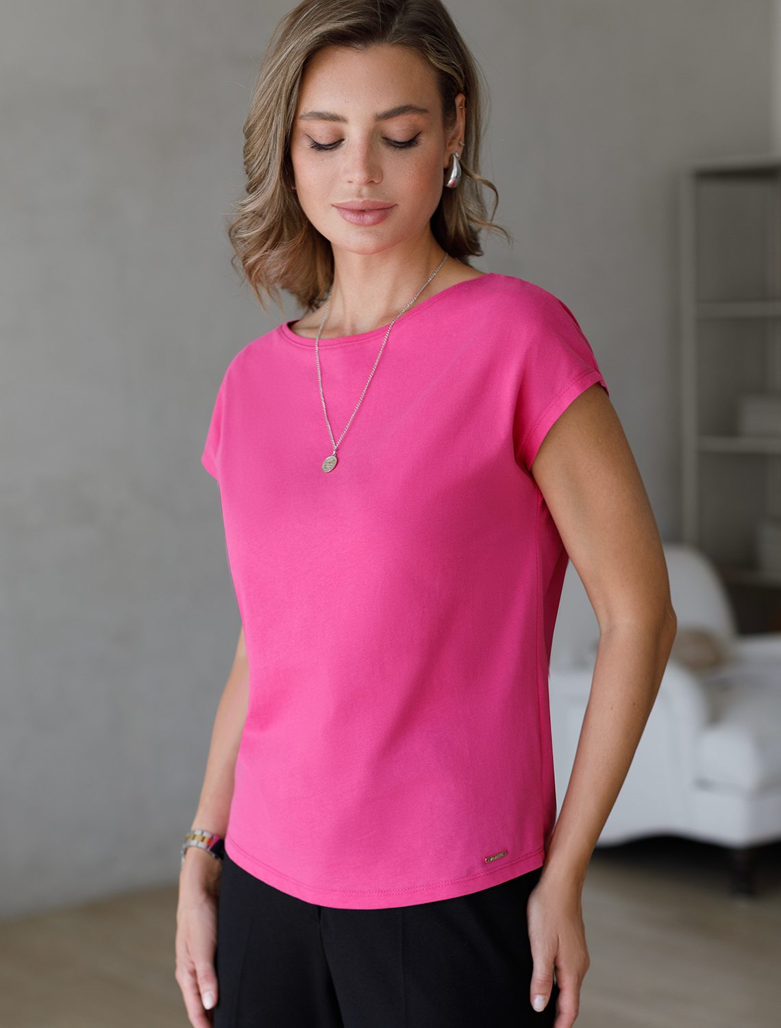 Футболка из 100% хлопка с цельнокроеным рукавом. Изделие отлично держит форму, почти не мнется и комфортно сидит по фигуре. Отдельным украшением служит металлический логотип бренда. розовая фуксия