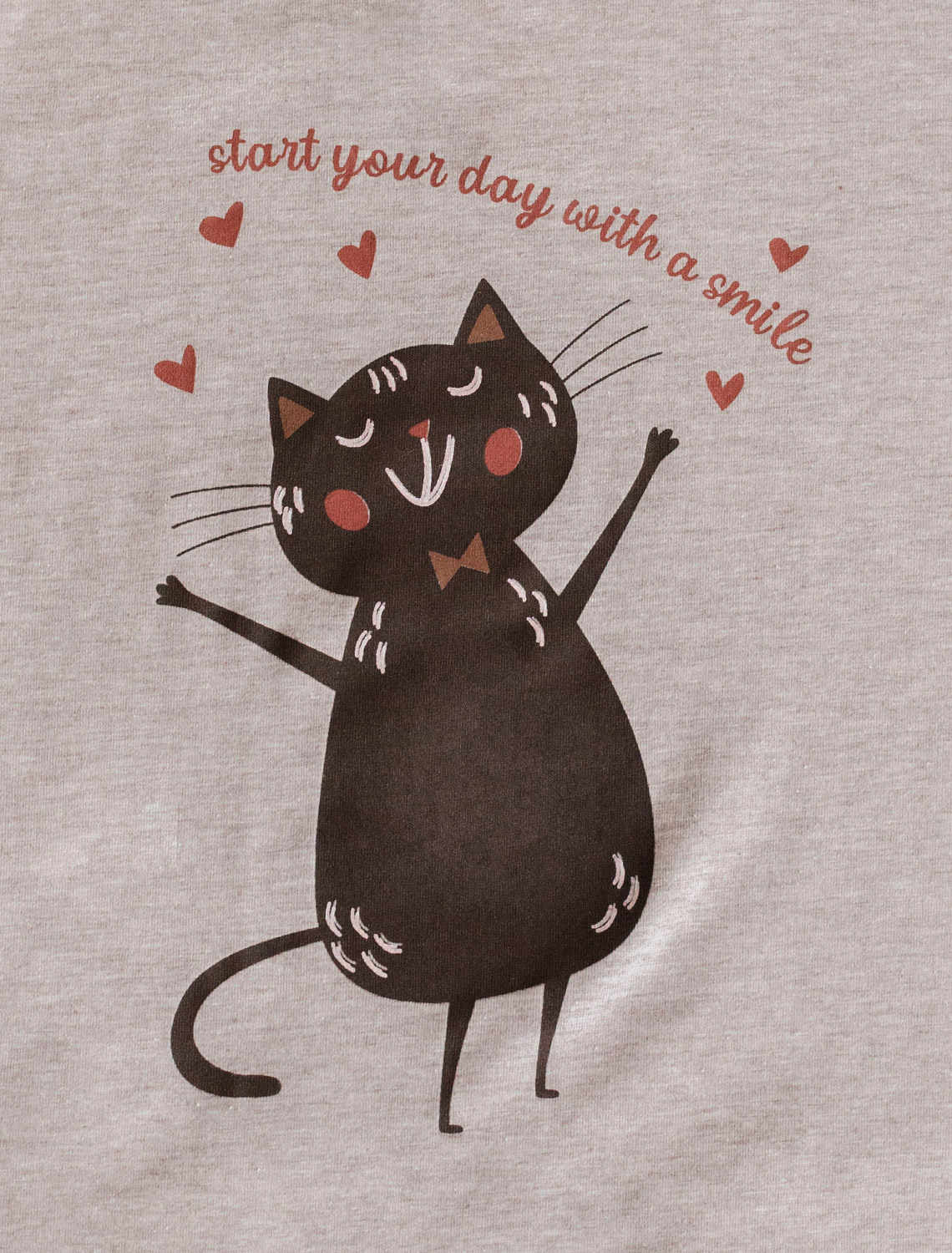 Особое внимание привлекает стильный принт в виде кота и сердечек с минималистичной надписью. Перевод надписи Start your day with a smile - Начни свой день с улыбки. Принт выполненны красками с устойчивым покрытием, который добавляет изделию оригинальности и позволяет выразить индивидуальность.
