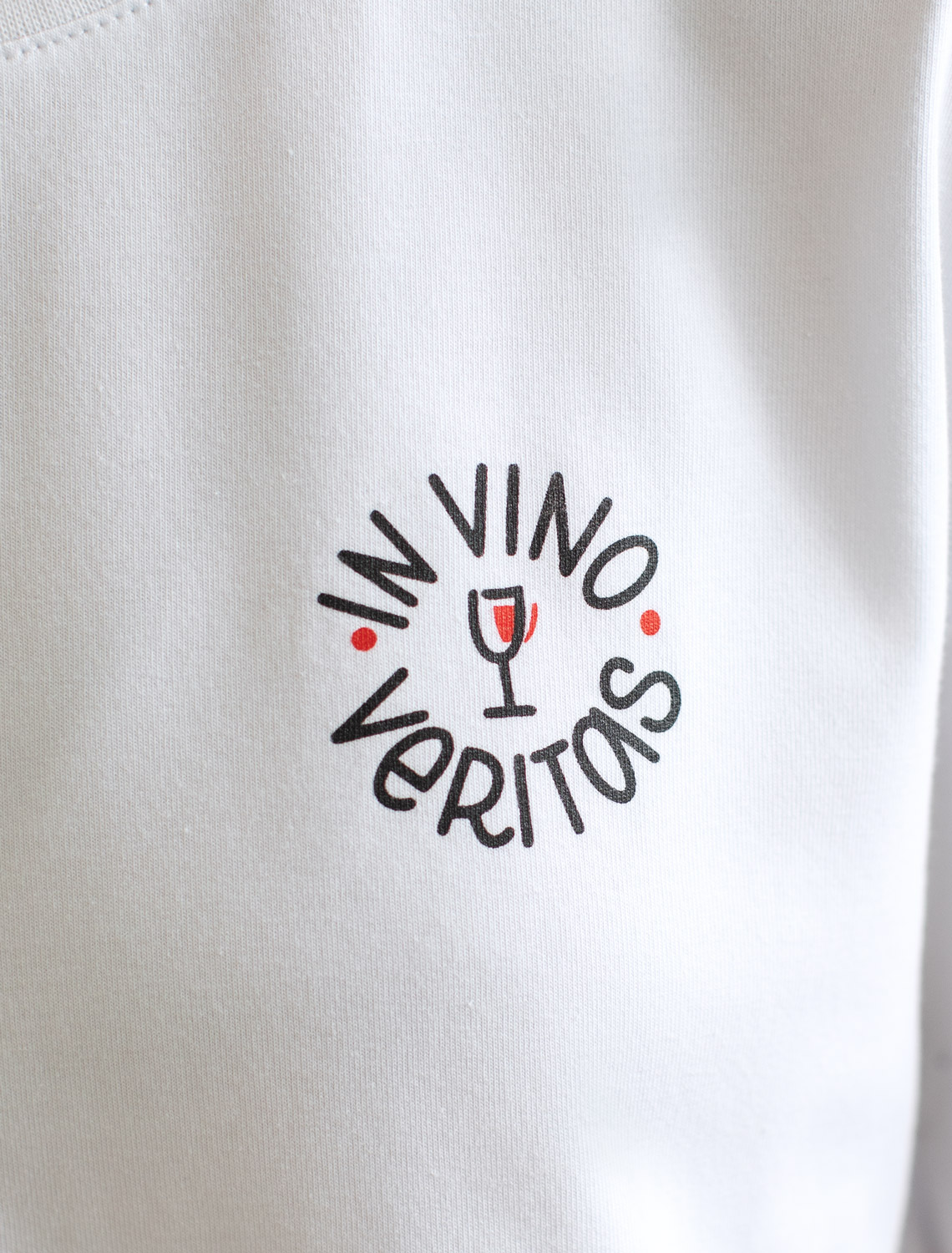 Особое внимание привлекает стильный принт в виде бокала с минималистичной надписью. Перевод надписи In vino veritas - Приходит вино - уходит истина. Принт выполнен красками с устойчивым покрытием, который добавляет изделию оригинальности и позволяет выразить индивидуальность.