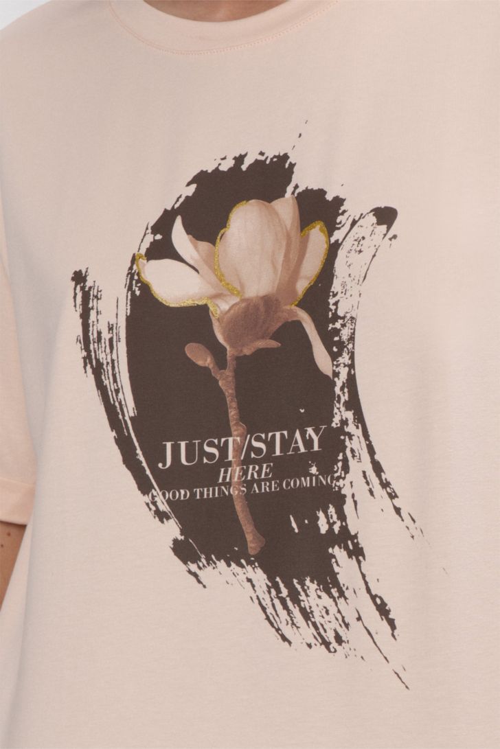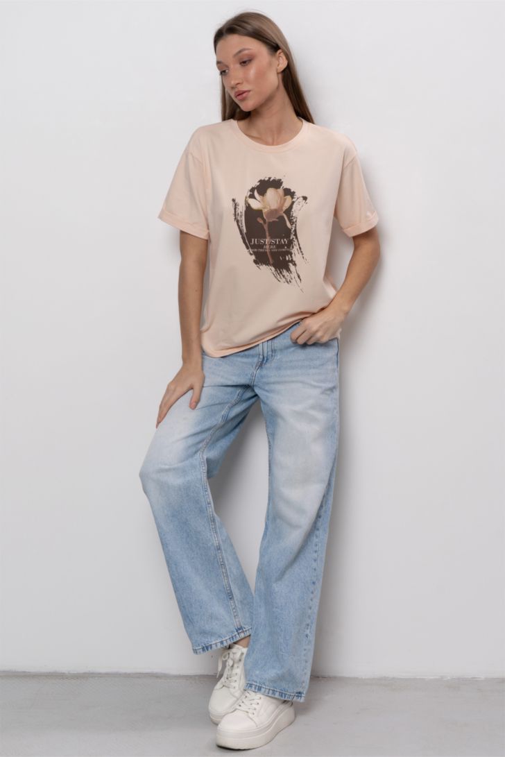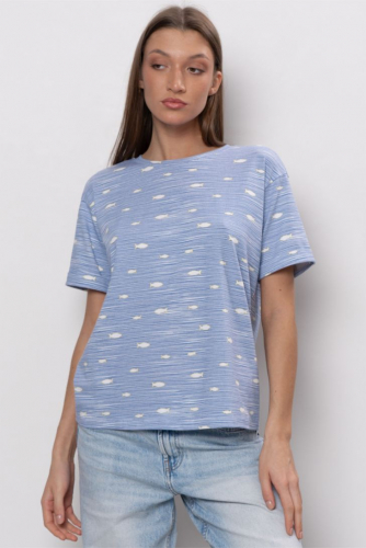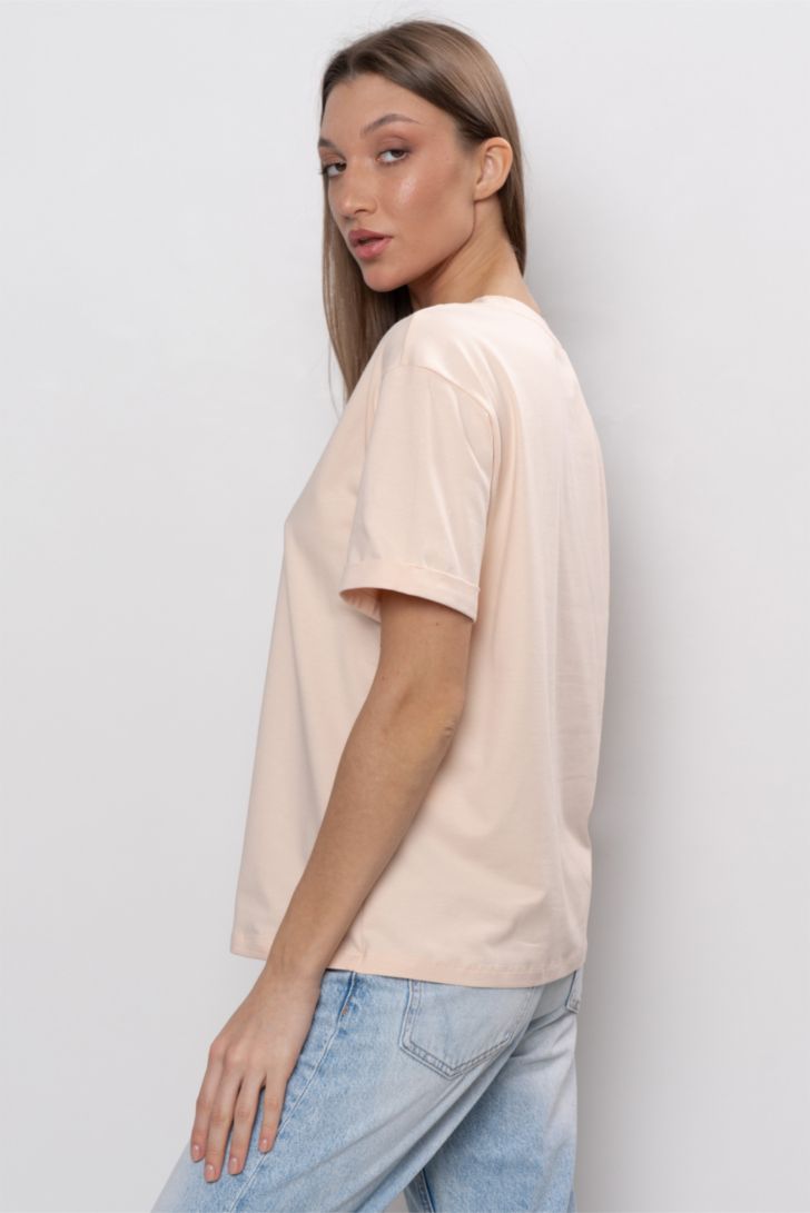 Футболка свободного прилегания. Вырез горловины круглый. Рукав короткий с отворотом, который декорирован киперной лентой.