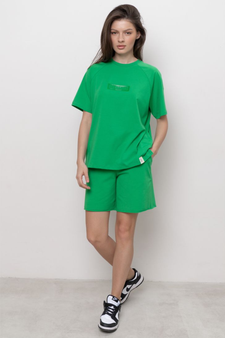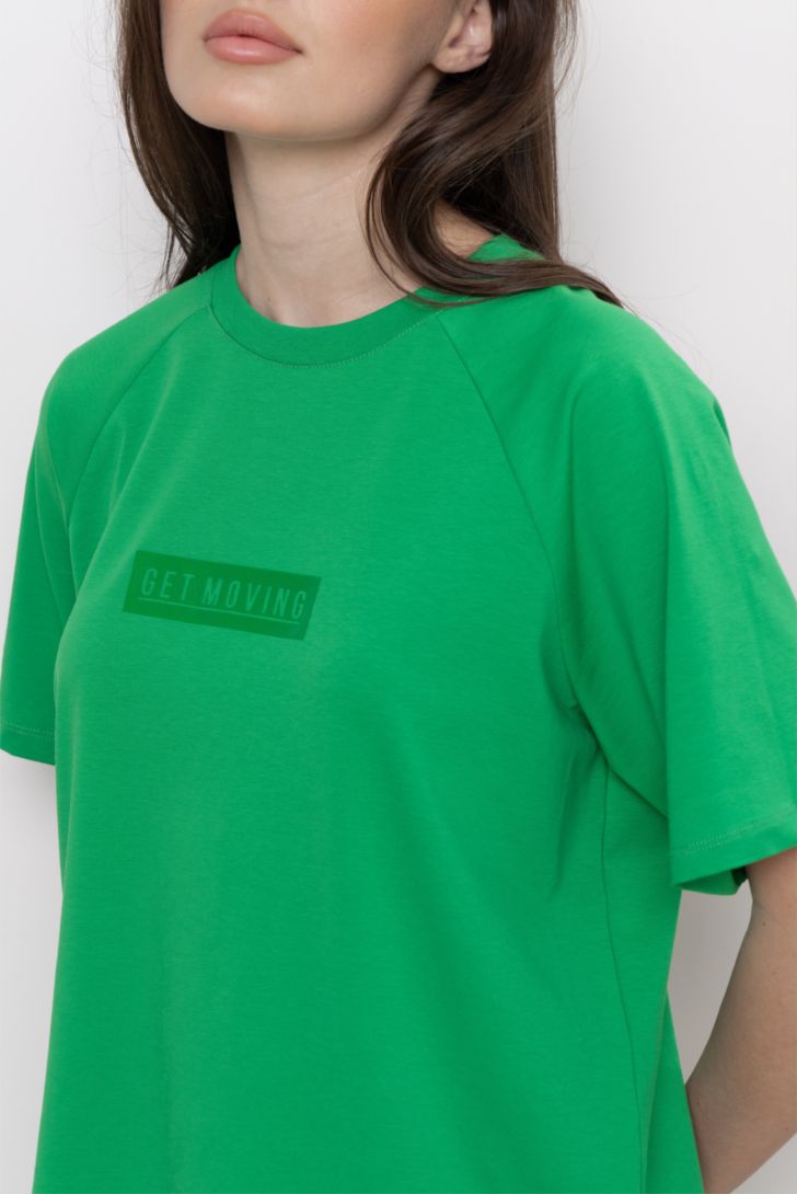 Футболка свободного прилегания с рукавом реглан. Вырез горловины круглый. Модель декорирована тематическим минималистичным принтом и брендовой нашивкой. В боковых швах разрезы. Хлопок 95%, Эластан 5%