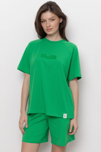 Футболка свободного прилегания с рукавом реглан. Вырез горловины круглый.