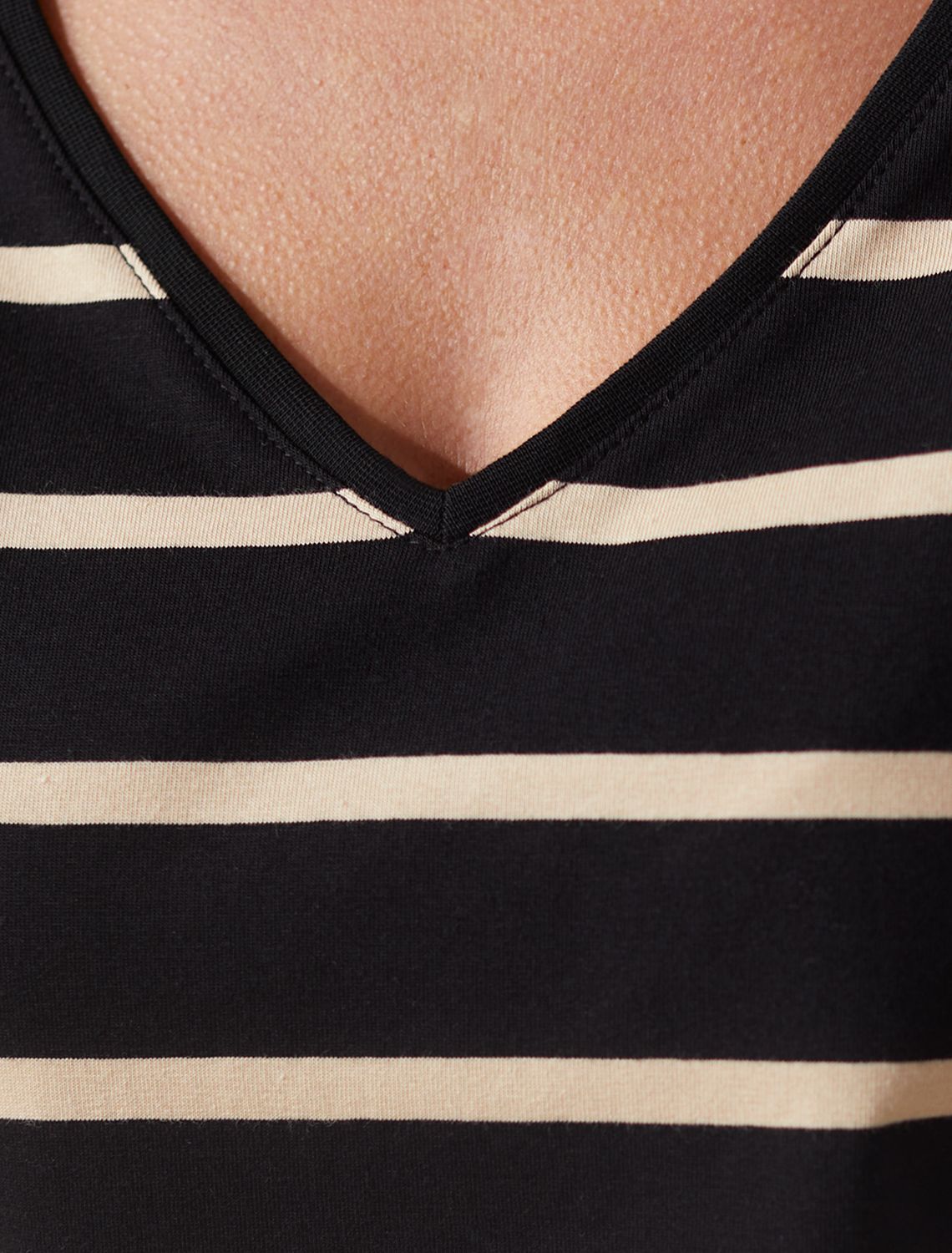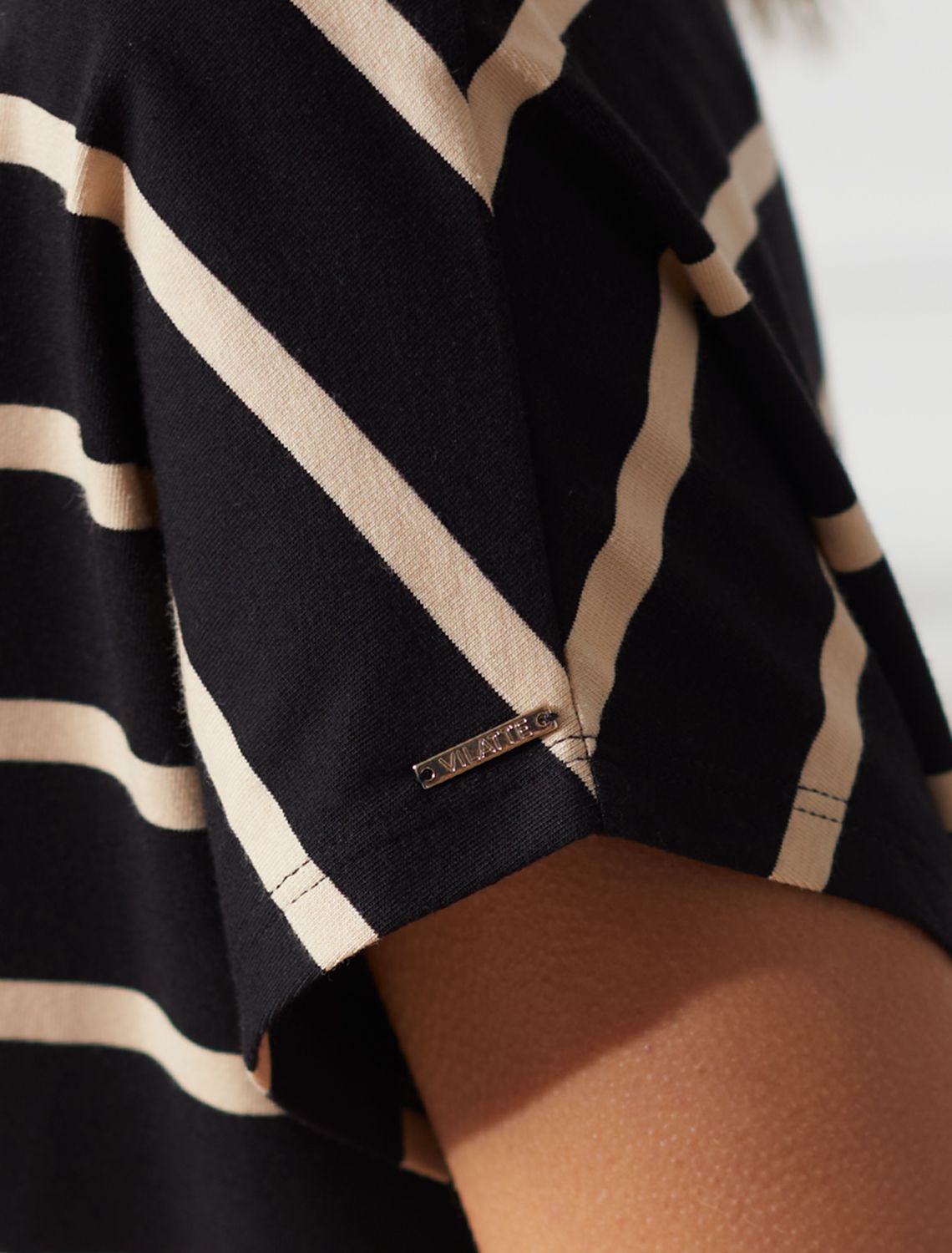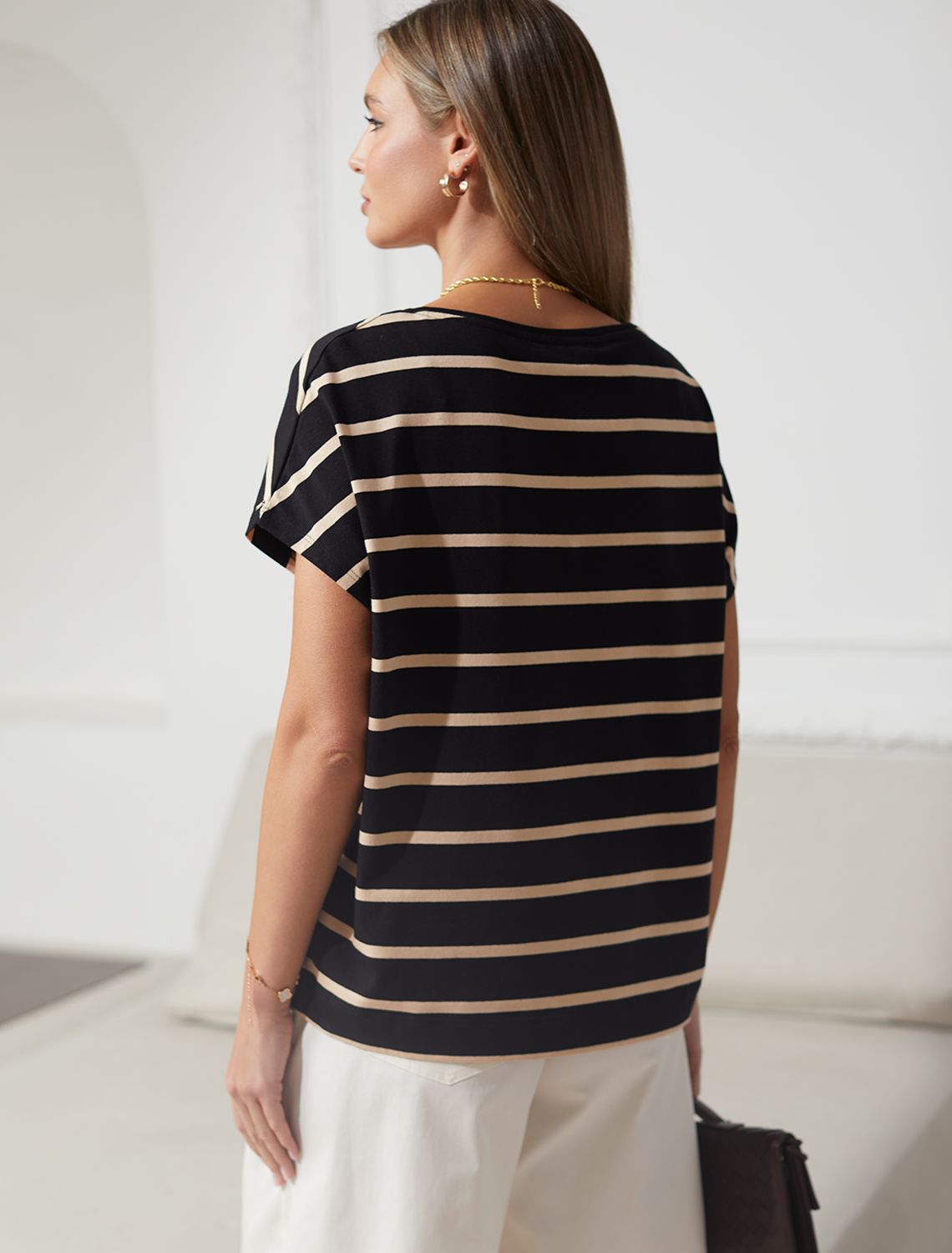 Стильная свободная футболка черно-бежевого цвета с горизонтальной полоской и выразительным V-вырезом создана для девушек и женщин, которые ценят комфорт и натуральность. Прямой крой обеспечивают непревзойденную легкость в теплую и жаркую погоду, позволяя телу дышать. Натуральный хлопок премиального качества — отличается дышащими свойствами и высокой износостойкостью, подходит для самой чувствительной кожи. V вырез гармонично подчеркивает линию шеи, такой вырез визуально удлиняет силуэт, подчеркивая достоинства фигуры. Цельнокроеный рукав гарантирует свободу движений и аккуратную посадку, что особенно актуально для активного образа жизни. Принт полоска расположена горизонтально, что добавляет образу динамики и современности. Подойдет на большие размеры, комфортно сидит любой фигуре. Повседневная футболка сочетается с базовыми и акцентными элементами одежды, позволяет создавать различные повседневные или яркие образы.