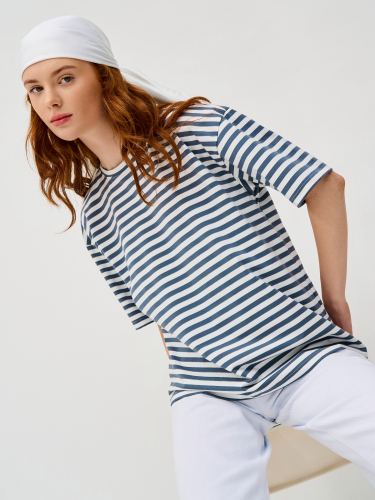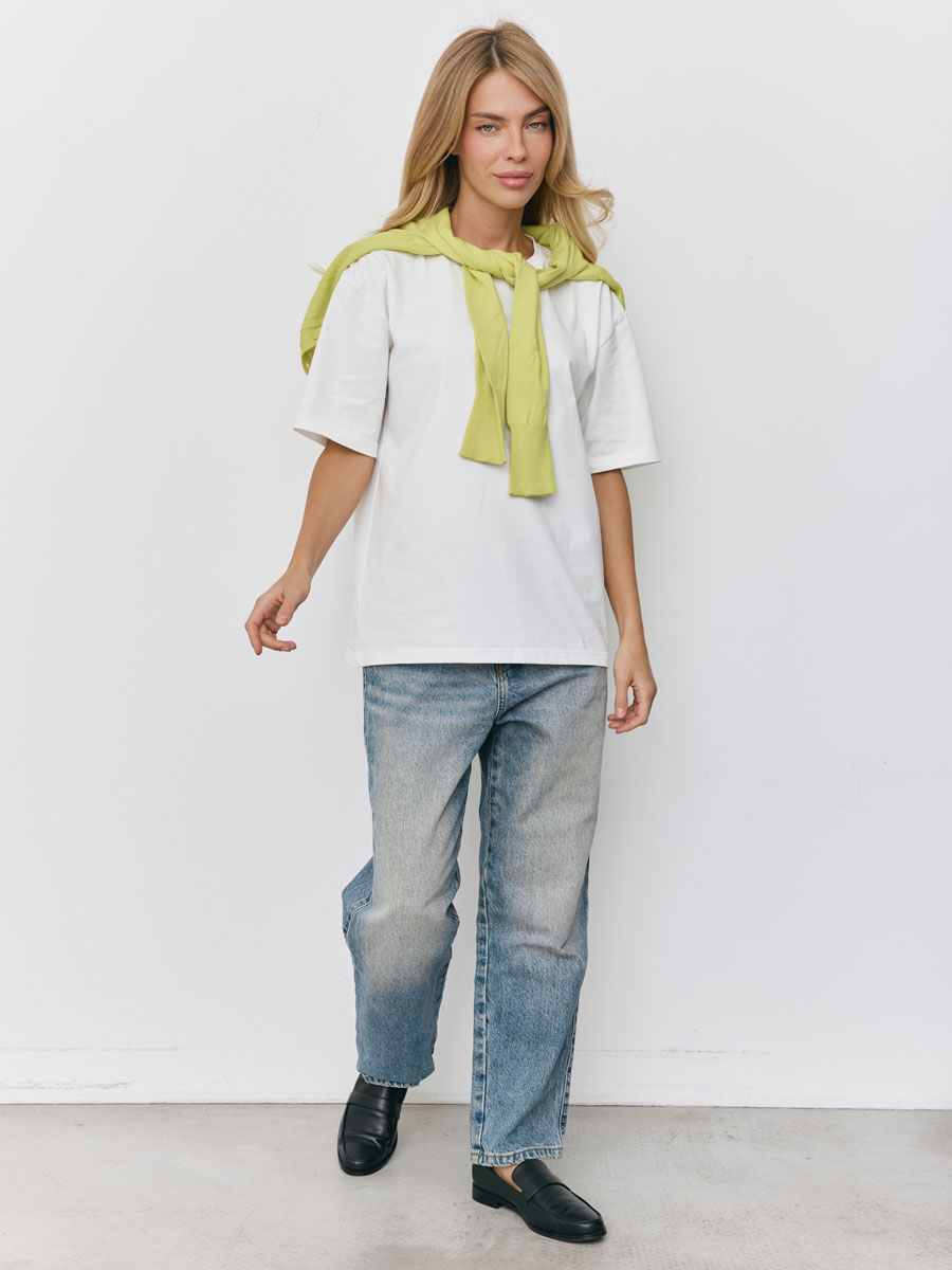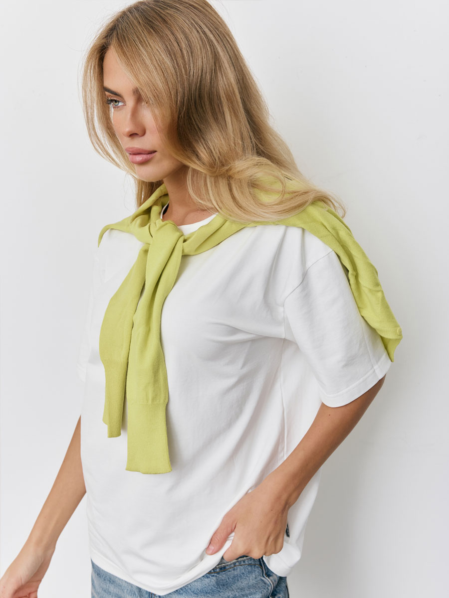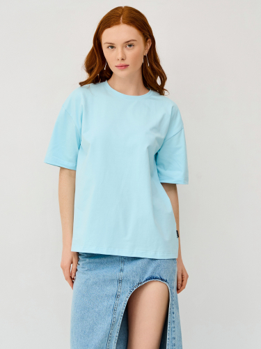 Женская футболка из кулирки с лайкрой, с втачным коротким рукавом. Горловина обработана бейкой из основной ткани. Низ изделия и низ рукава подвернуты и подшиты.