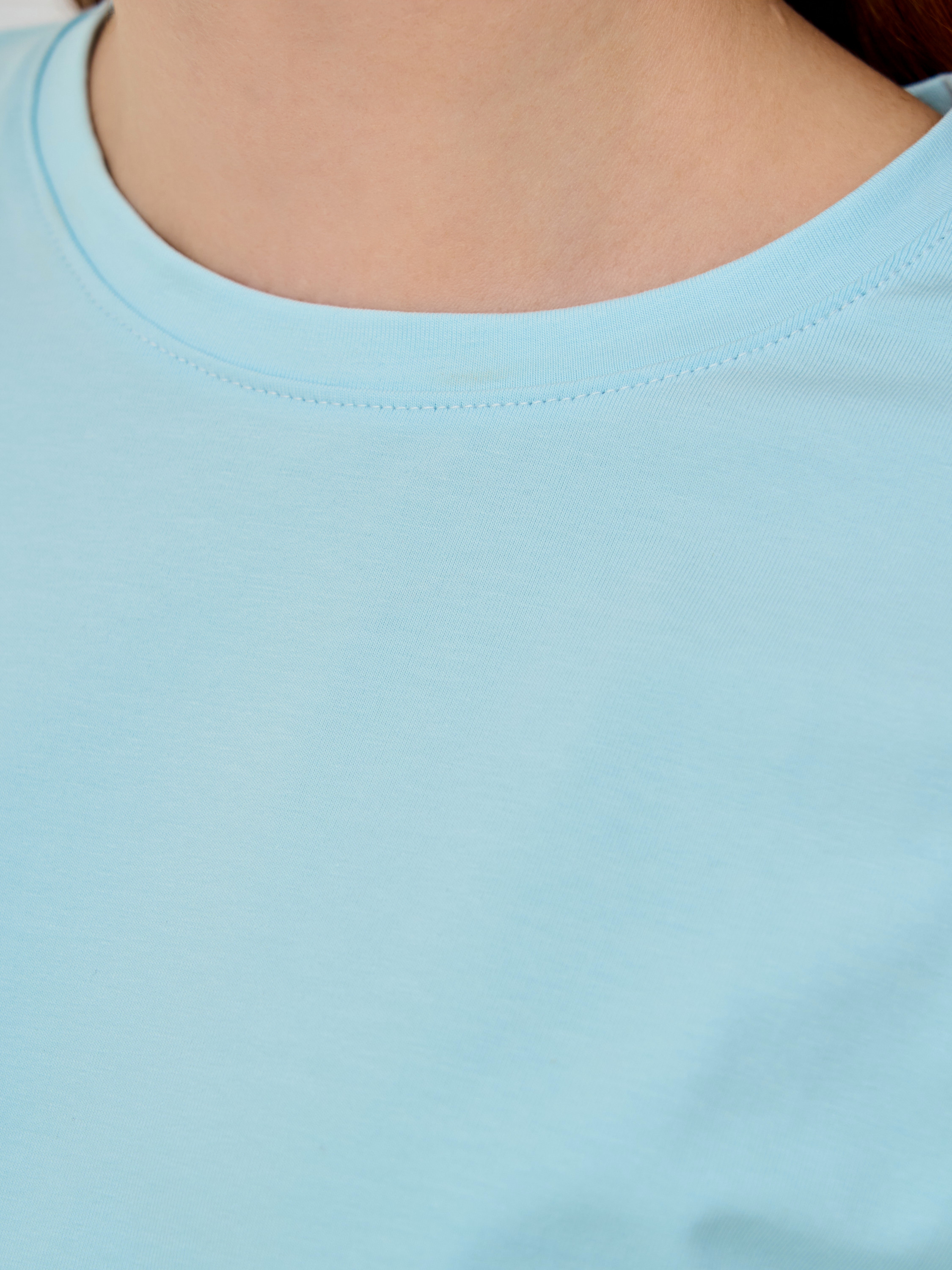 Женская футболка из кулирки с лайкрой, с втачным коротким рукавом. Горловина обработана бейкой из основной ткани. Низ изделия и низ рукава подвернуты и подшиты.