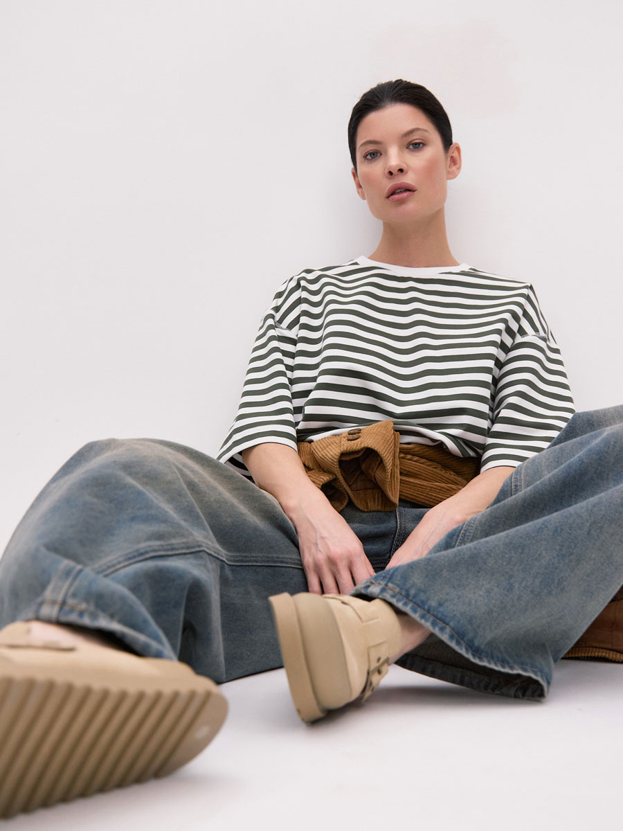 Женская футболка OVERSIZE из футера 2-х нитки с лайкрой, с втачным коротким рукавом. Горловина обработана бейкой из кашкорсе. Низ изделия и низ рукава подвернуты и подшиты.