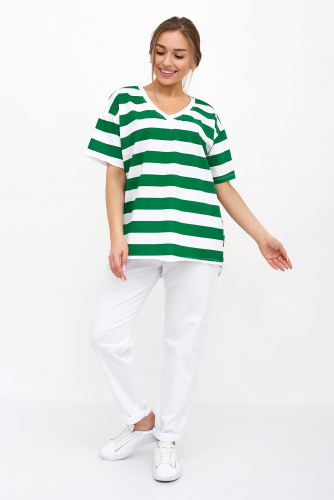 Футболка Фурор из 100% хлопка станет Вашим фаворитом в выборе повседневной одежды. Она отлично сочетается с шортами, брюками, бриджами и спортивной обувью. Воротник мысиком, короткие рукава, футболка немного укорочена спереди и удлиненная со спинки. Можно одевать футболку на одно плечо, что придаст особый шарм и романтичность образу.  Удобная свободная посадка и красивая расцветка в полоску  – делают модель очень привлекательной.