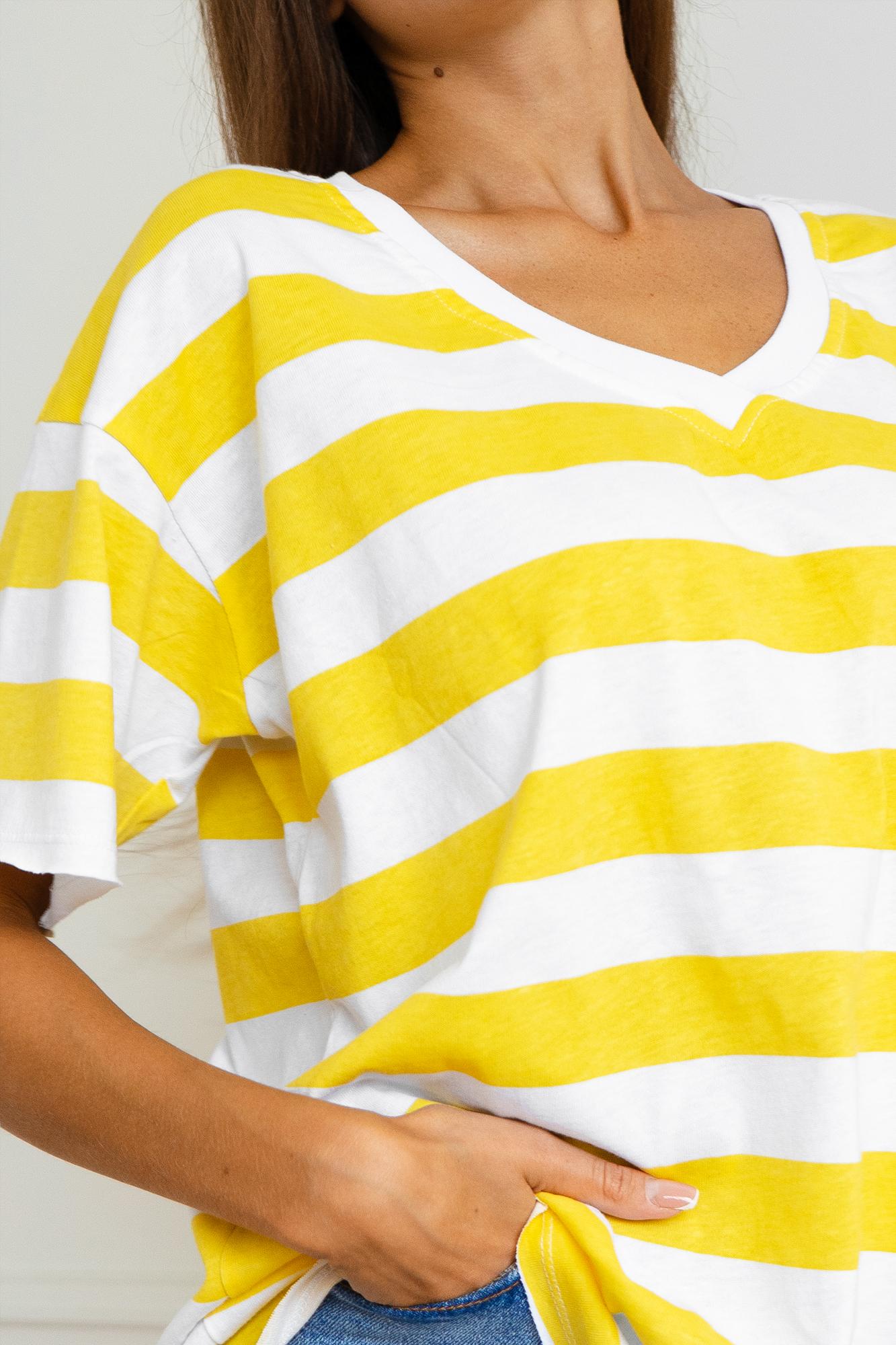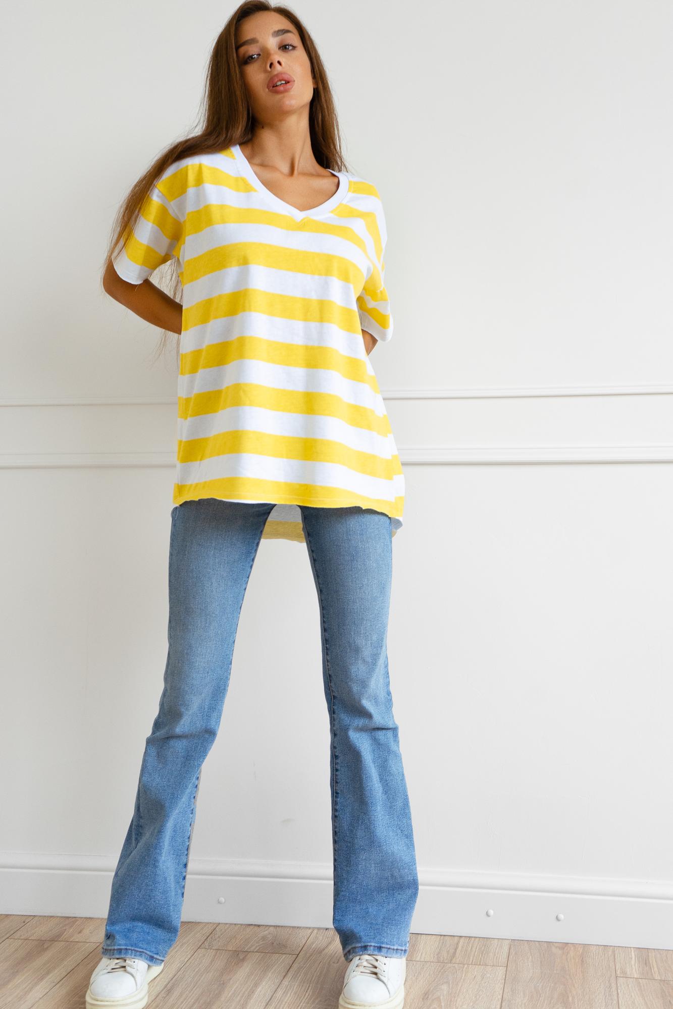 Футболка Фурор из 100% хлопка станет Вашим фаворитом в выборе повседневной одежды. Она отлично сочетается с шортами, брюками, бриджами и спортивной обувью. Воротник мысиком, короткие рукава, футболка немного укорочена спереди и удлиненная со спинки. Можно одевать футболку на одно плечо, что придаст особый шарм и романтичность образу.  Удобная свободная посадка и красивая расцветка в полоску  – делают модель очень привлекательной.