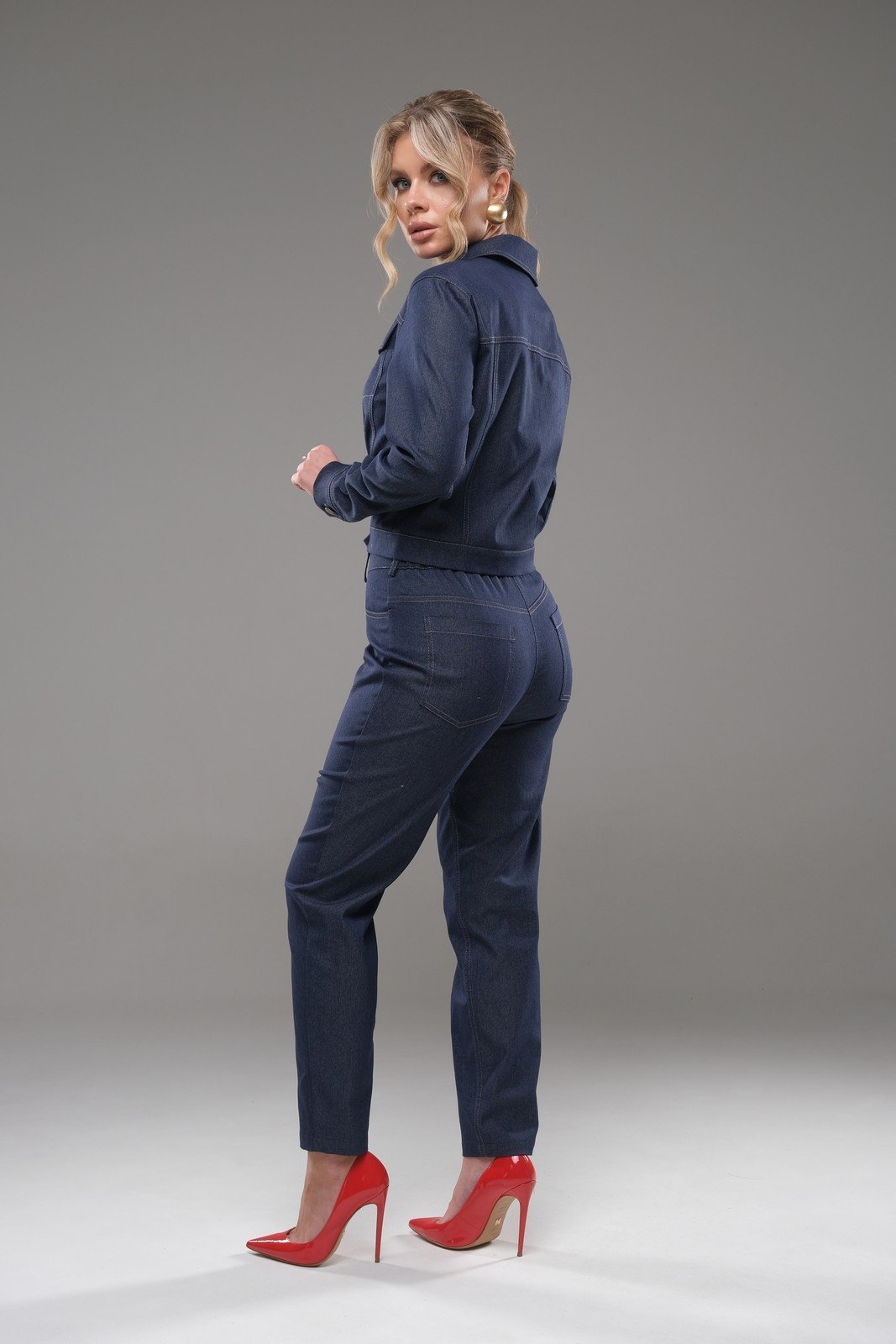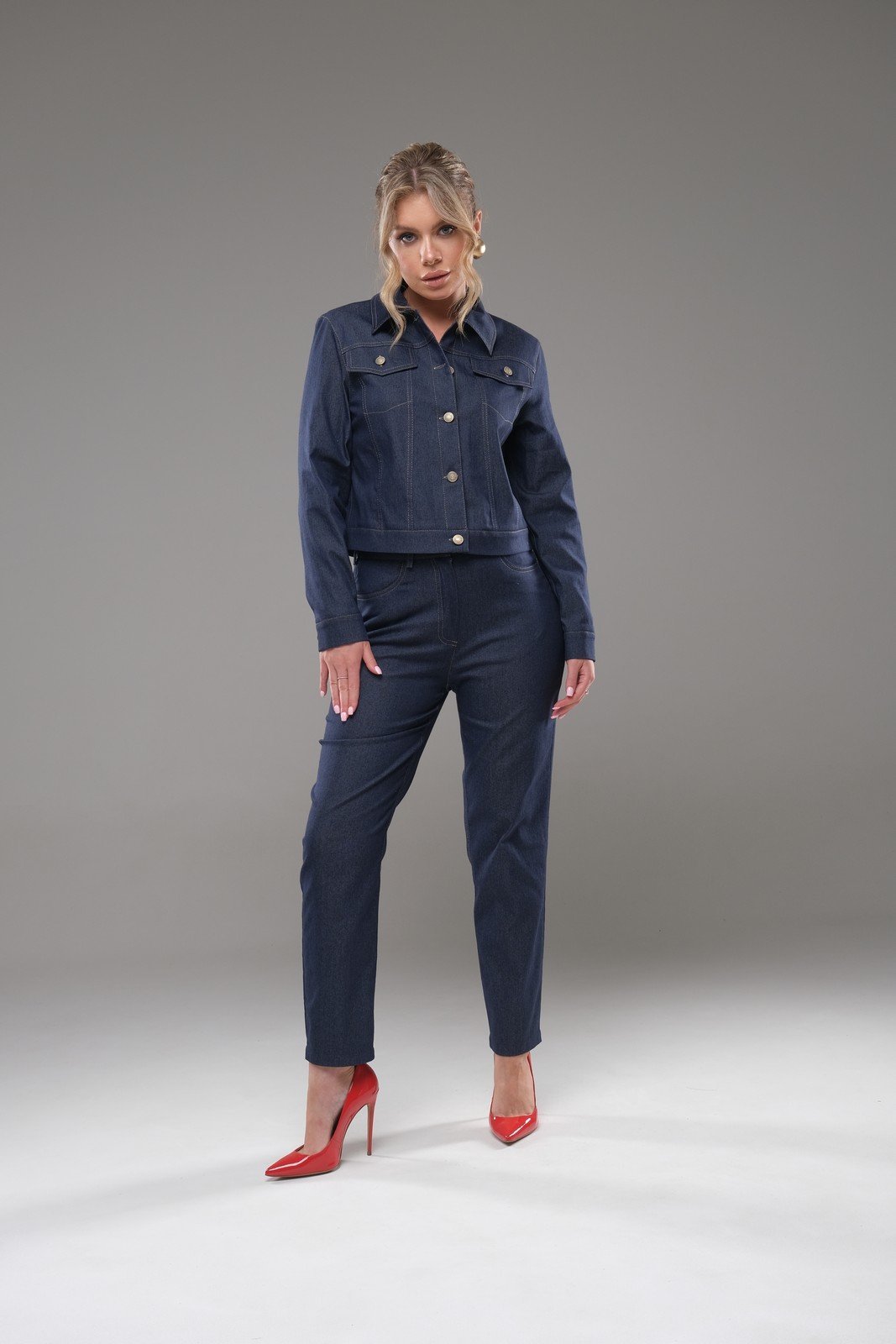 Костюм женский - жакет и брюки, изготовлен из текстильной ткани с небольшим содержанием стрейча. Жакет длиной немного ниже линии талии. Рукав длинный, рубашечного типа, линия проймы спущена. Застежка до верха на петли и пуговицы. В верхней части переда и спинки - кокетки. Нижняя часть переда и спинки оформлена вертикальными рельефами. По переду под кокетками находятся декоративные клапаны. На задней части рукава-рельеф с манжетой внизу и застежкой на петли пуговицы. Низ жакета оформлен планкой. Воротник стояче - отложной, без стойки спереди.