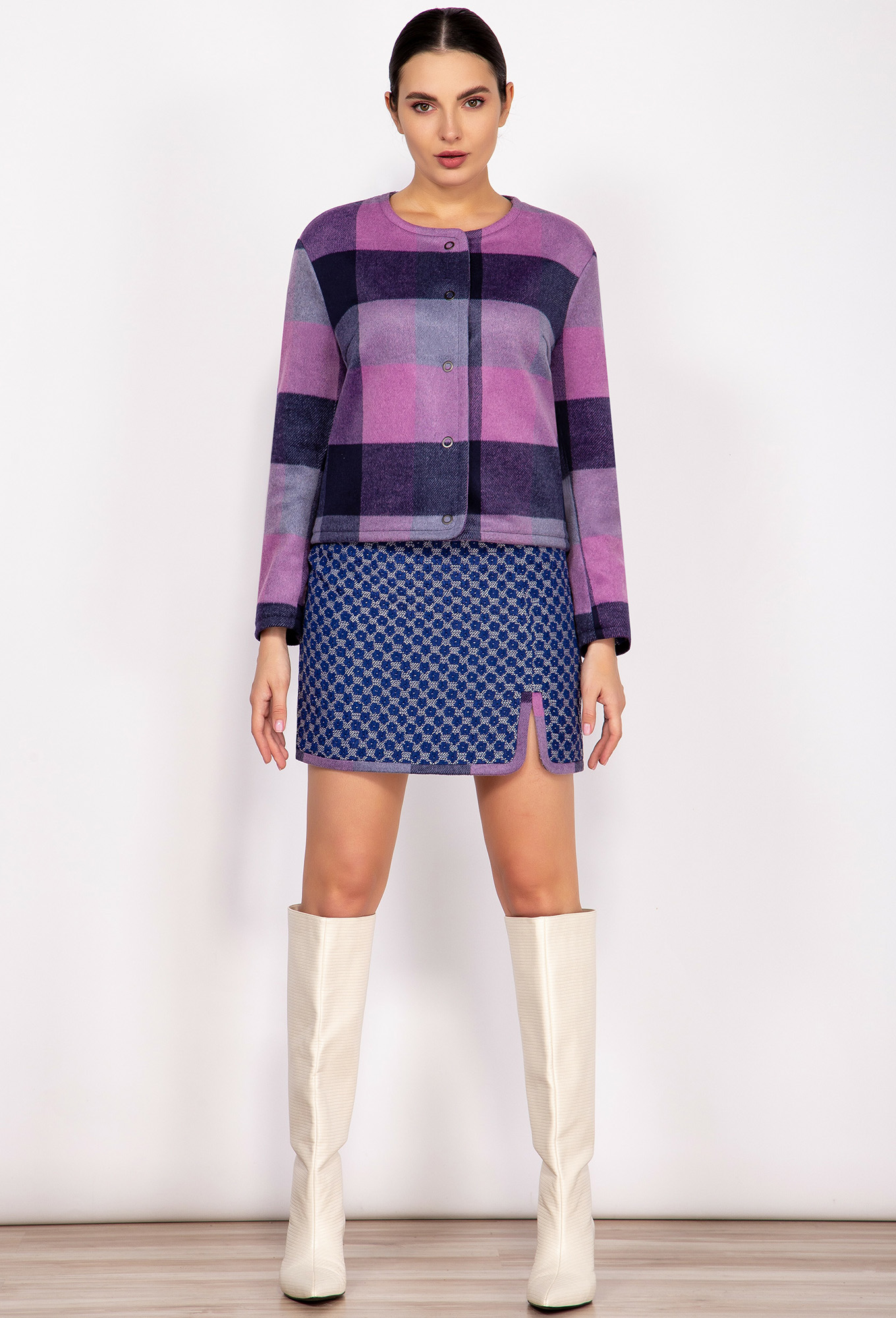 Стильный и теплый костюм. Жакет прямого силуэта с нагрудной вытачкой из бокового шва и спущенной линией плеча. Рукав втачной двухшовный. Застежка центральная с закругленными краями борта на 5 кнопок. Перед с настрочными карманами. Вдоль горловины, борта, низа изделия и рукава, и вдоль верхнего края кармана притачана планка из отделочной ткани.