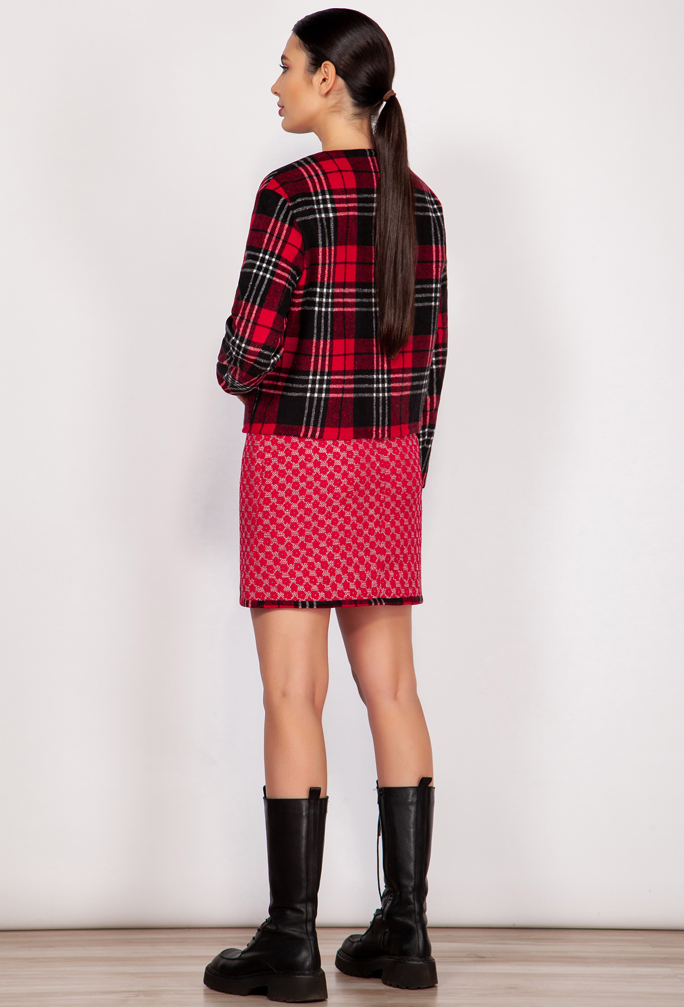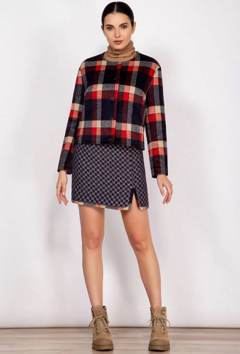 Стильный и теплый костюм. Жакет прямого силуэта с нагрудной вытачкой из бокового шва и спущенной линией плеча. Рукав втачной двухшовный. Застежка центральная с закругленными краями борта на 5 кнопок. Перед с настрочными карманами. Вдоль горловины, борта, низа изделия и рукава, и вдоль верхнего края кармана притачана планка из отделочной ткани.