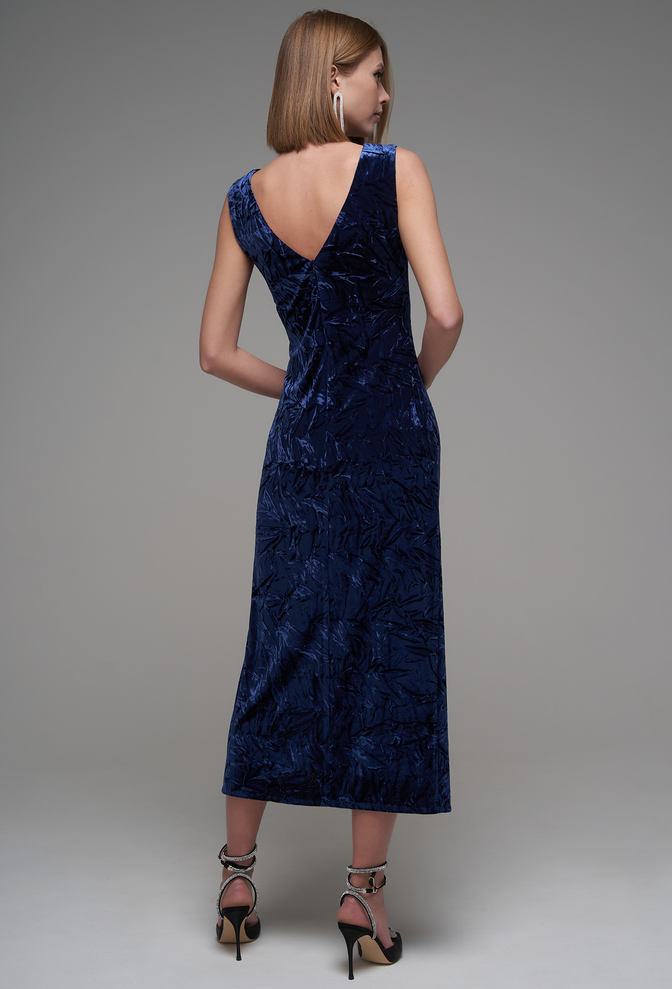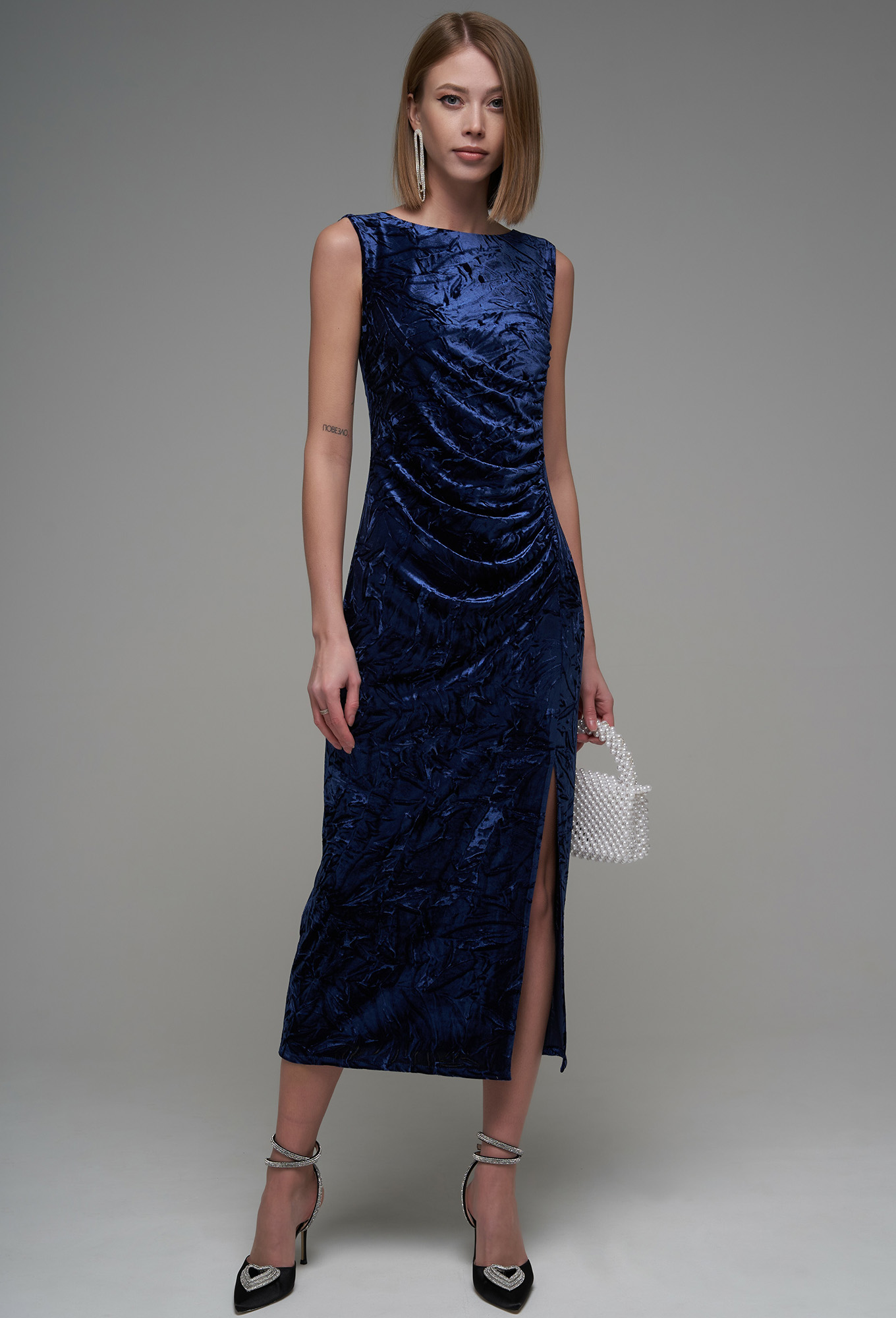 Платье полуприлегающего силуэта с вырезом горловины -"лодочка". Левая часть переда с рельефом от проймы, переходящим в высокий разрез. Правая часть переда с драпировкой в рельефе. Спинка с талиевыми вытачками. В среднем шве спинки обработана потайная молния. Фурнитура может быть изменена, сохраняя целостность художественного замысла. Длина платья по середине спинке-104см.