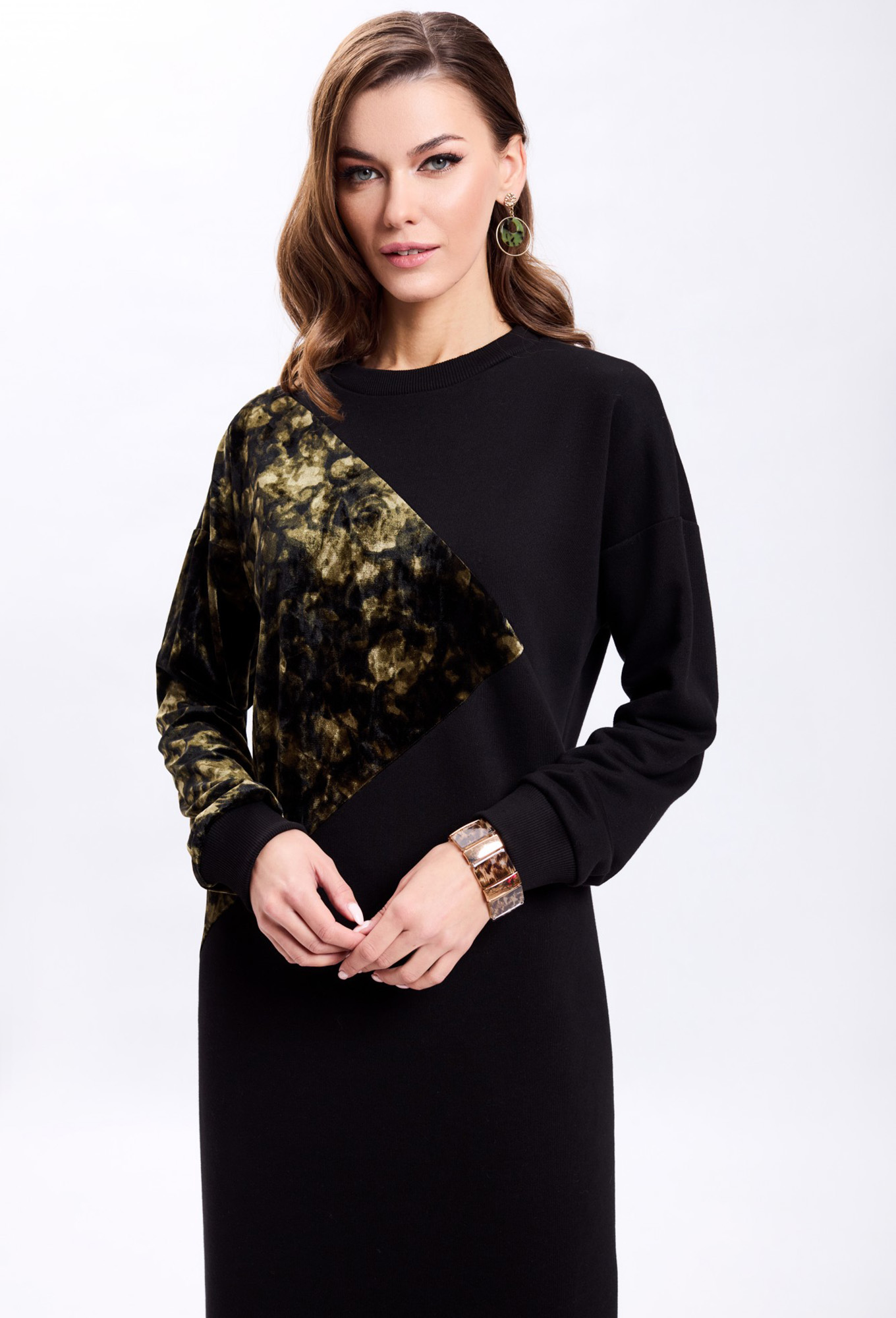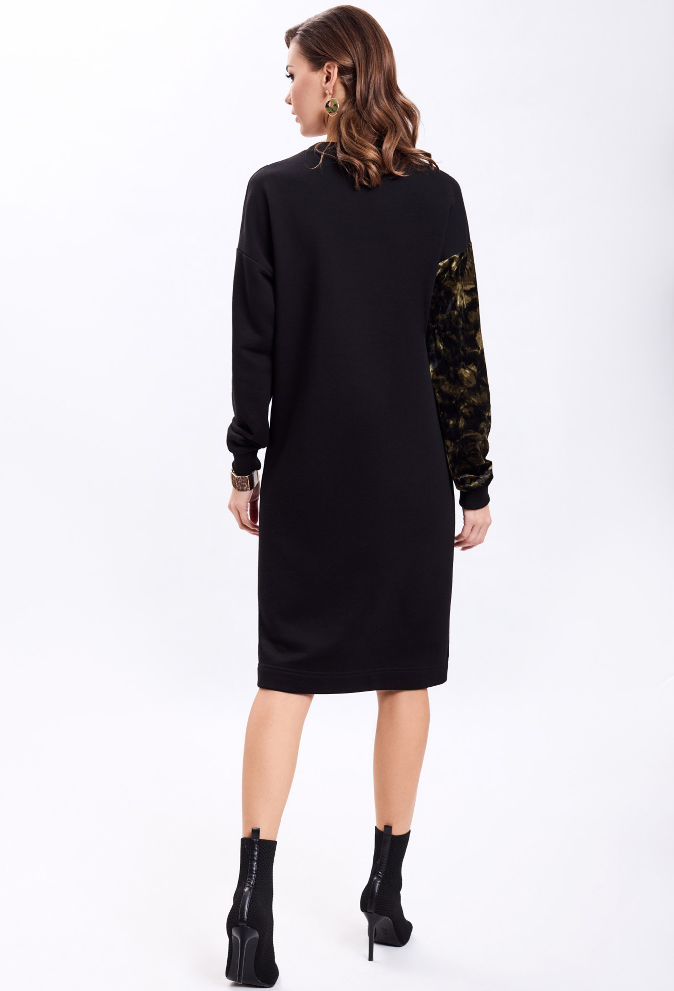 Платье прямого силуэта со спущенной линией плеча. Рукав втачной одношовный. По переду платья - два ассиметричных подреза по диагонали. Правая верхняя часть переда и правый рукав выполнены из отделочной ткани. По низу рукава и горловине - притачная планка. Длина платья по середине спинки- 100см, длина рукава - 51см. Фурнитура может быть изменена, сохраняя целостность художественного замысла.