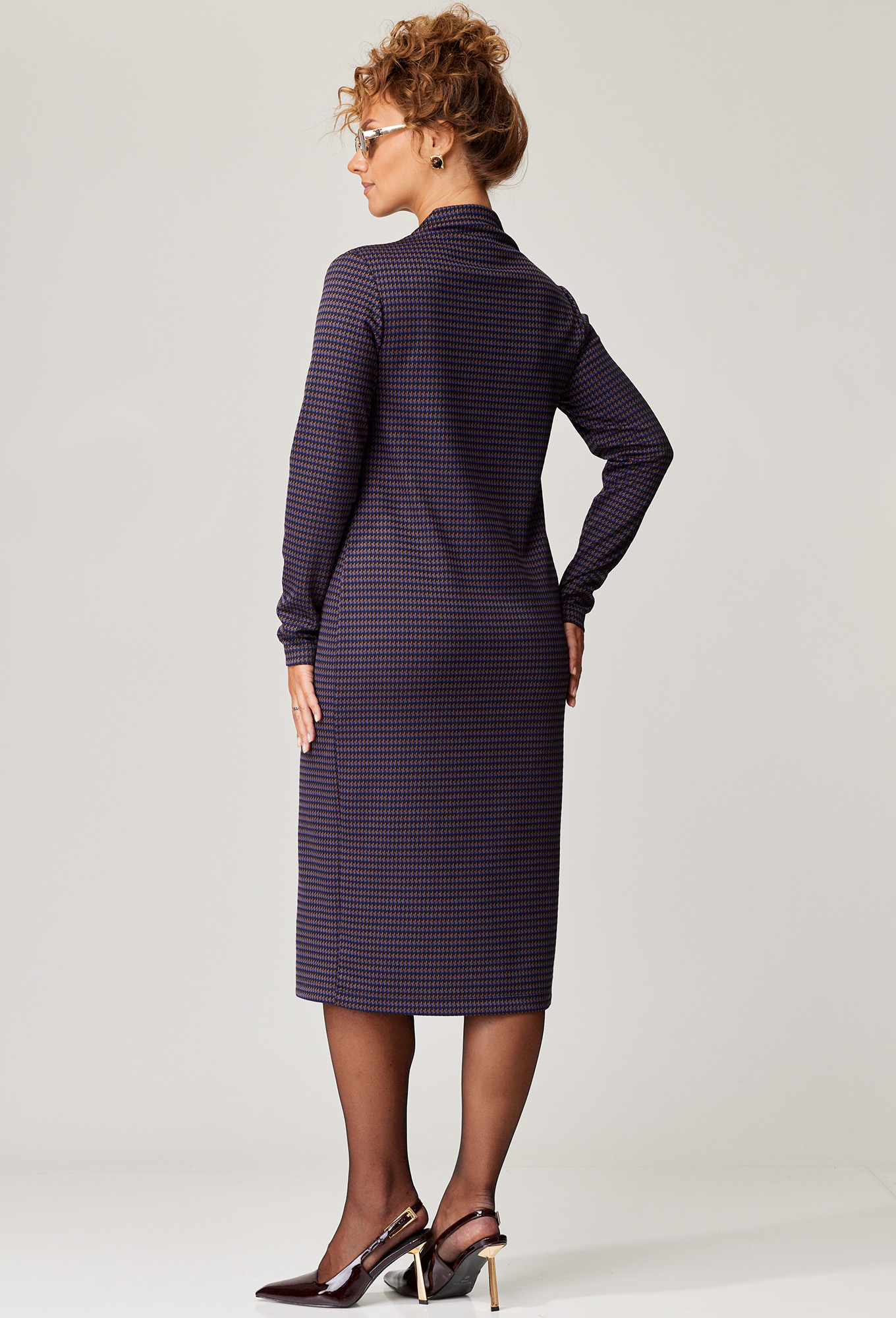 Платье слегка приталенного силуэта. Рукав втачной одношовный. Воротник небольшая цельнокроенная стойка. По переду - нагрудная вытачка, выходящая из бокового шва. По линиям втачивания рукавов спереди - фигурный вырез.