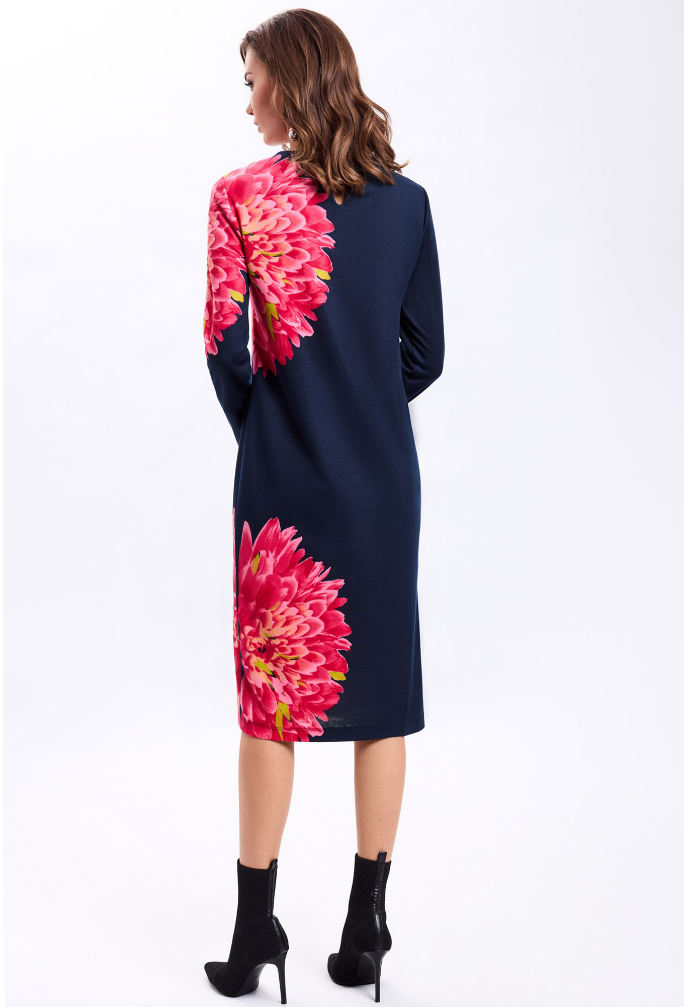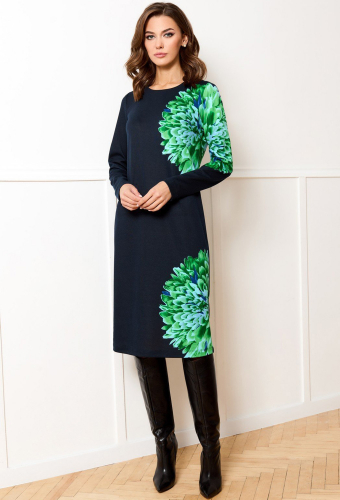 Платье прямого силуэта. Рукав втачной одношовный. По переду платья - нагрудная вытачка, выходящая из бокового шва. По горловине спинки - вырез "капелька" на одну пуговицу и навесную петлю. Длина по середине спинки -106 см, длина рукава-61 см. Фурнитура может быть изменена, сохраняя целостность художественного замысла.