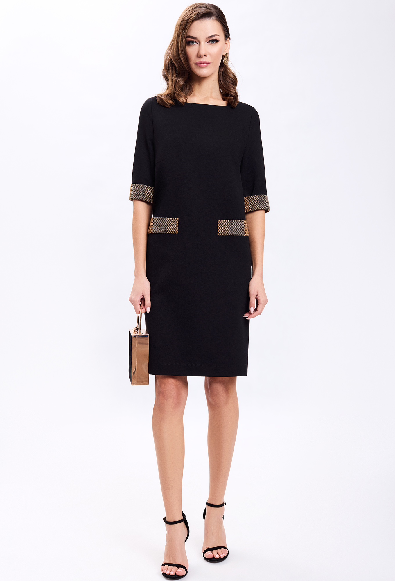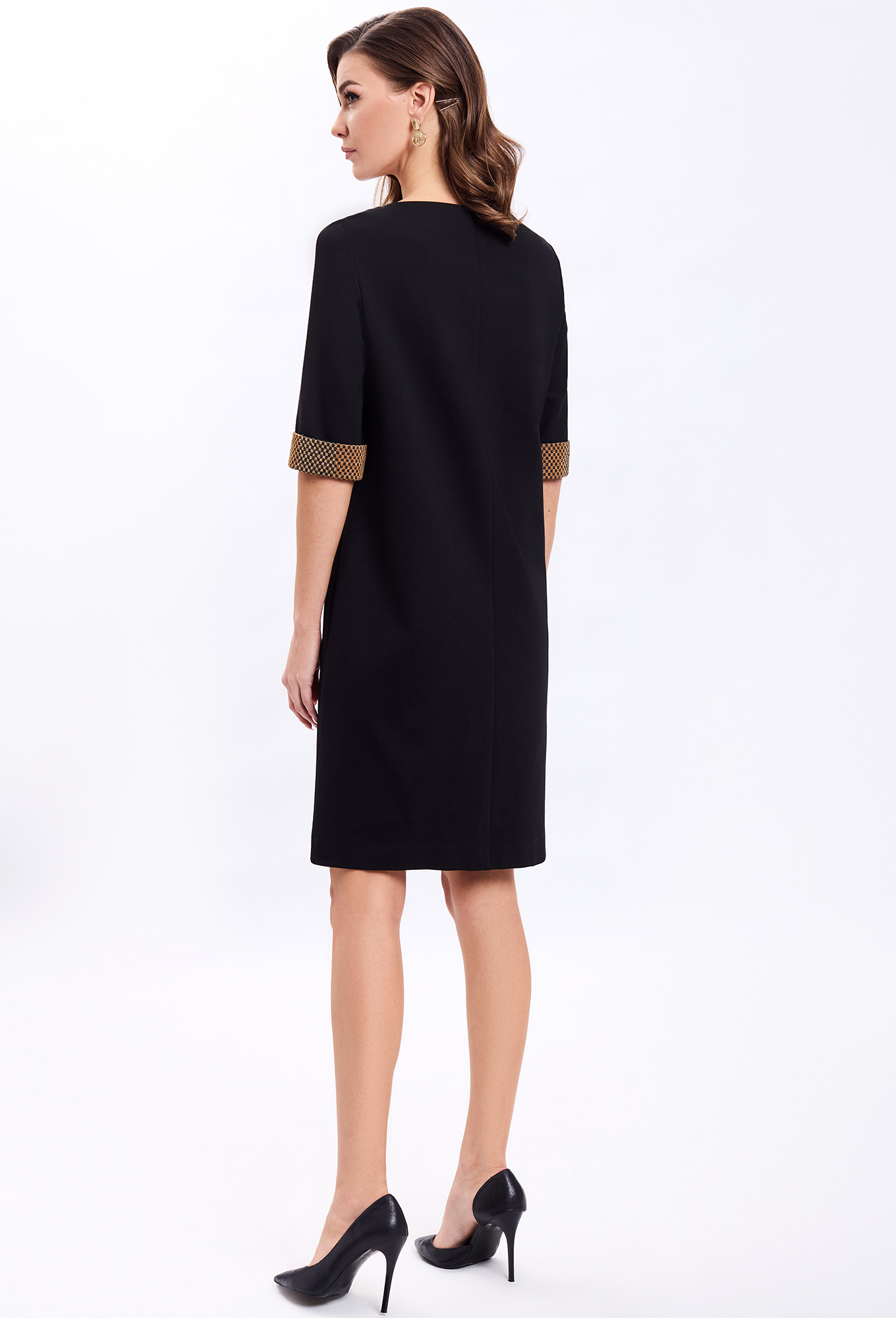 Платье прямого силуэта с нагрудными вытачками из бокового шва. Перед с декоративными листочками. Спинка со средним швом. Рукав втачной одношовный с притачной манжетой. Манжета и листочка выполнены из отделочной ткани. Фурнитура может быть изменена, сохраняя целостность художественного замысла.