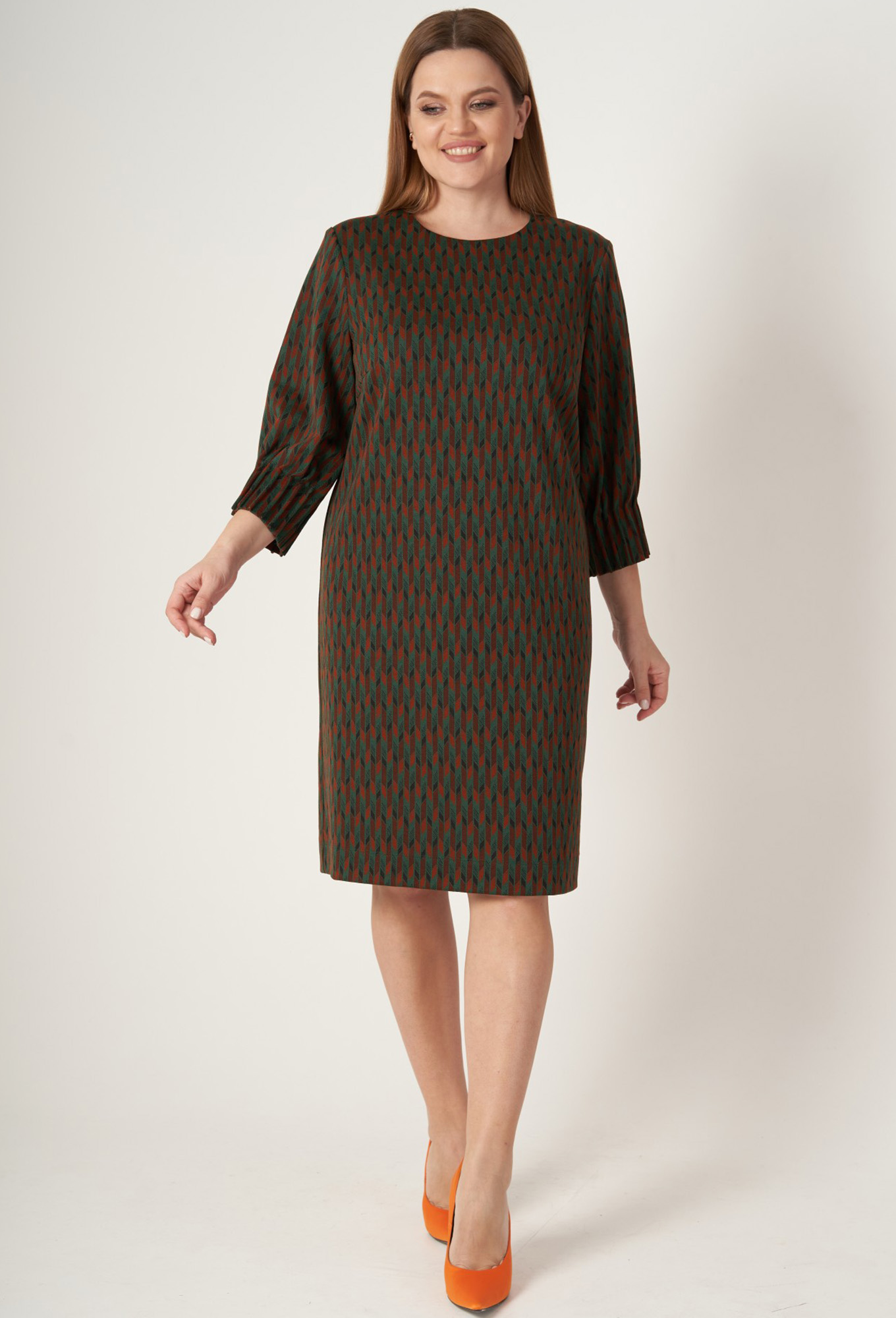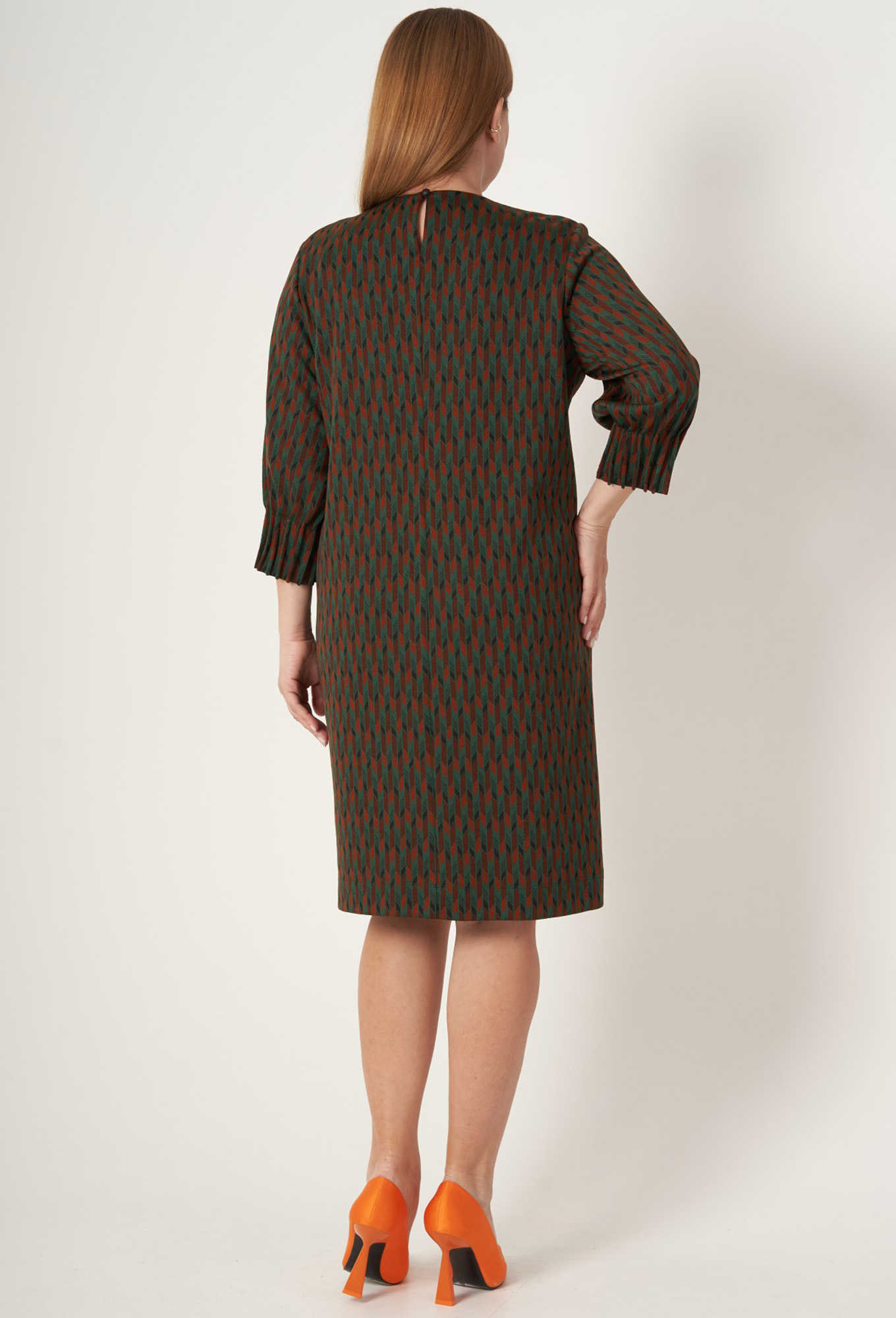 Платье прямого силуэта с нагрудными вытачками из бокового шва. Спинка со средним швом, в верху шва обработан разрез с застежкой на петлю и пуговицу. Рукав одношовный втачной, по низу застрочены защипы. Фурнитура может быть изменена, сохраняя целостность художественного замысла.