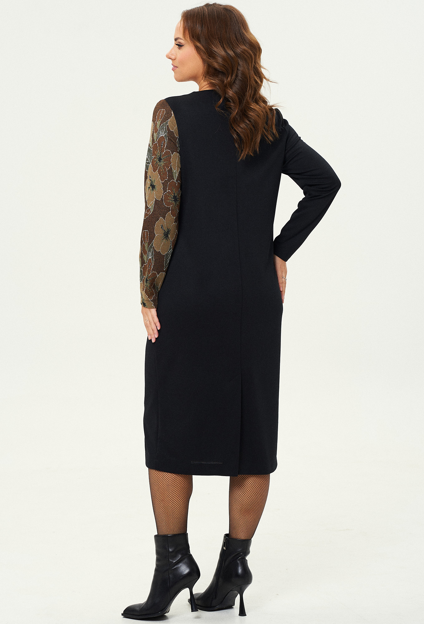 Платье полуприлегающего силуэта выполнено из трикотажной ткани двух цветов. Перед с фигурной вставкой из декоративной ткани. Спинка со средним швом. Внизу среднего шва шлица, вверху застежка на молнию. Рукав втачной одношовный. Левый рукав выполнен из декоративной ткани.