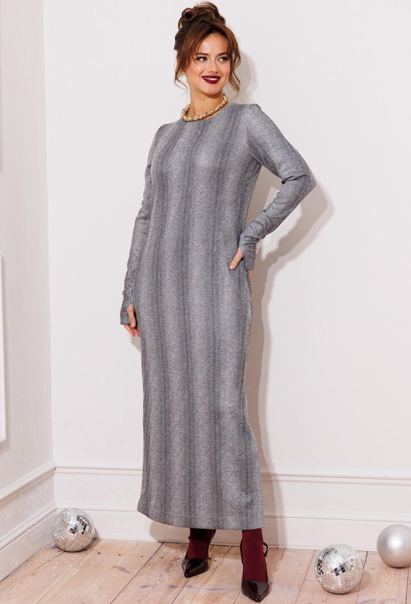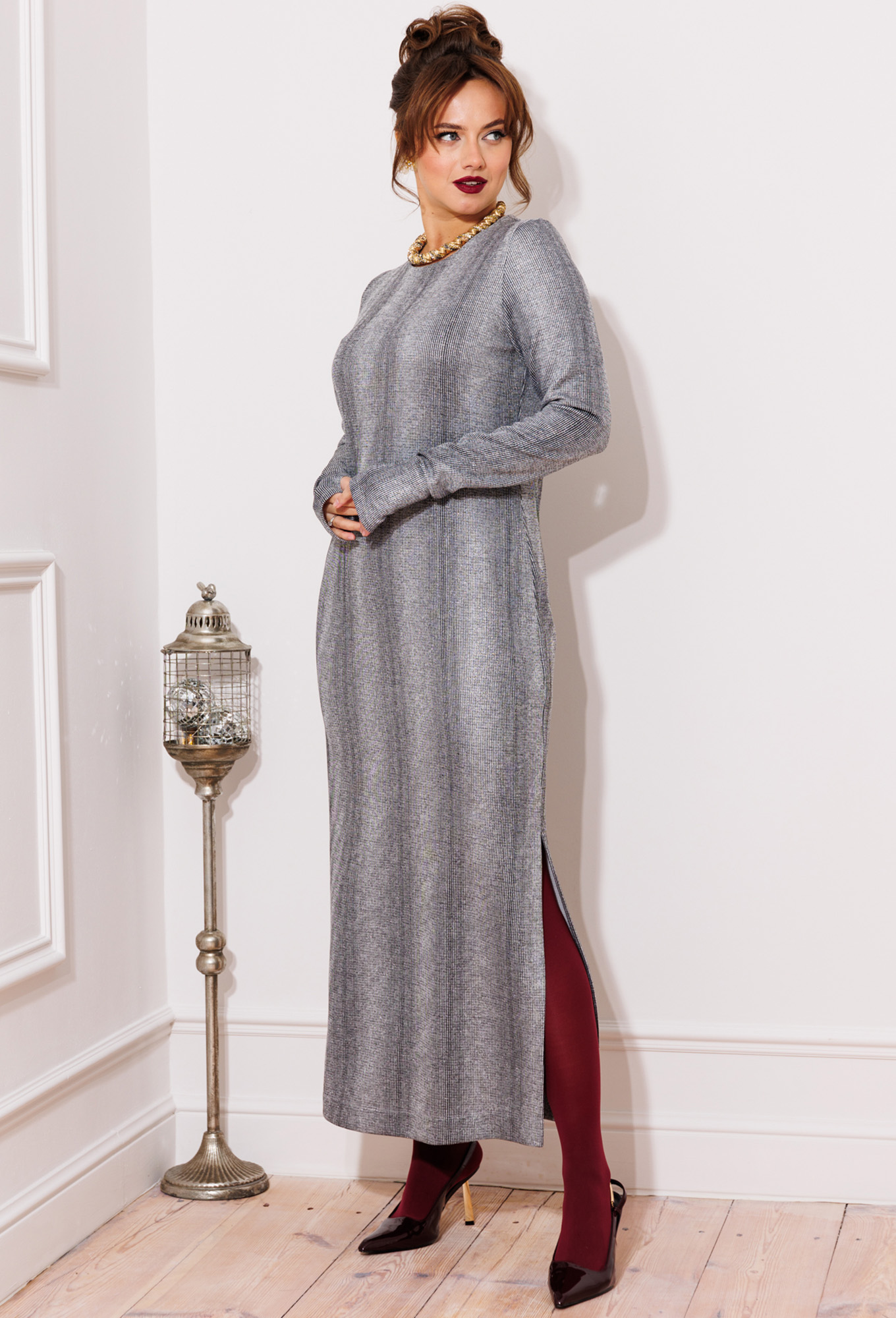 Платье прямого силуэта из трикотажной ткани с люрексом. В боковом шве разрез. Рукав втачной одношовный удлиненный с вырезом на палец на руке.