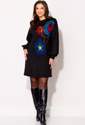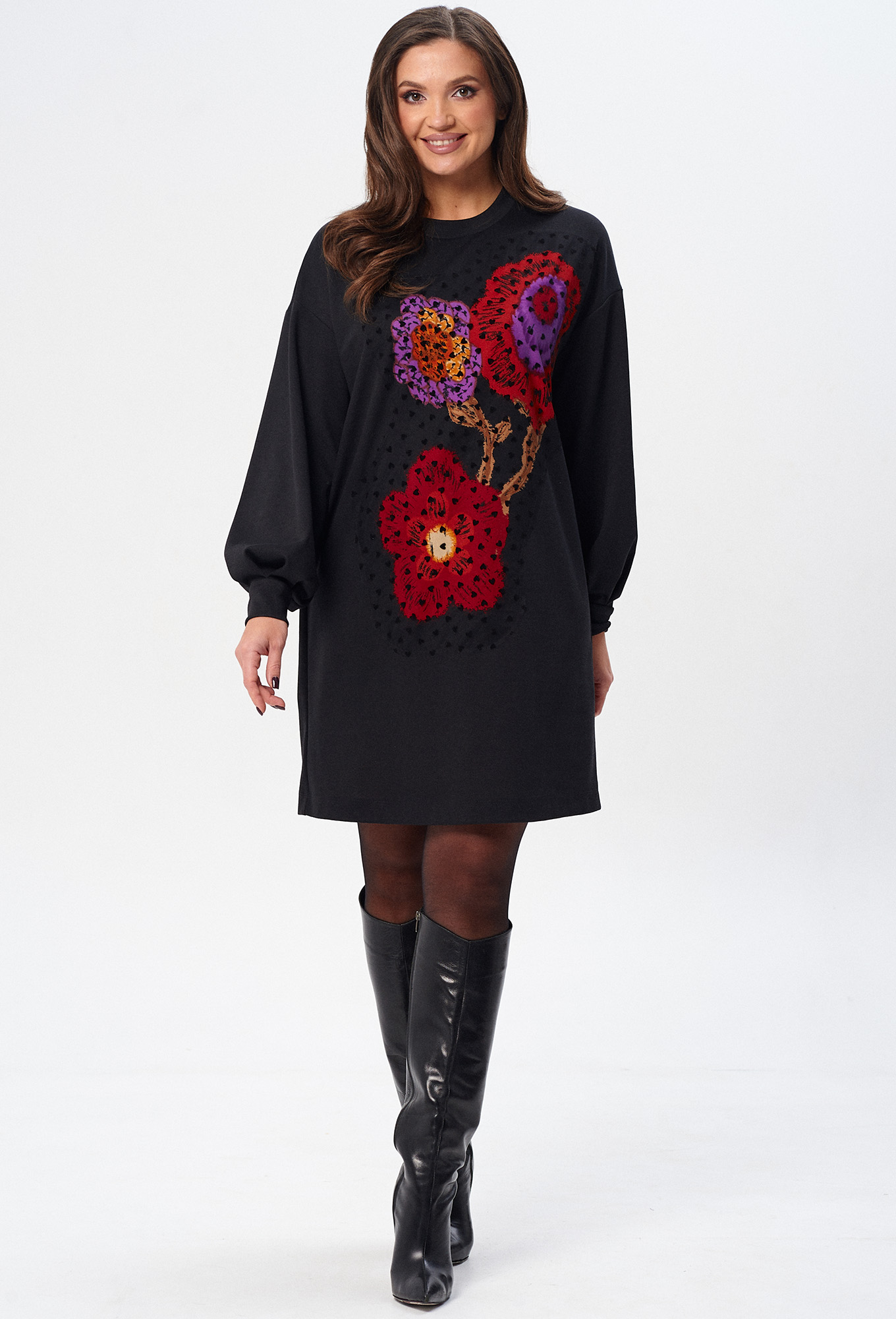 Платье (туника) свободного силуэта из трикотажной ткани с принтом. Рукав втачной одношовный со складками по низу и манжетой. Горловина обработана планкой. По переду поверх принта настрочена сетка. Сетка может быть заменена с сохранением художественного образа изделия.