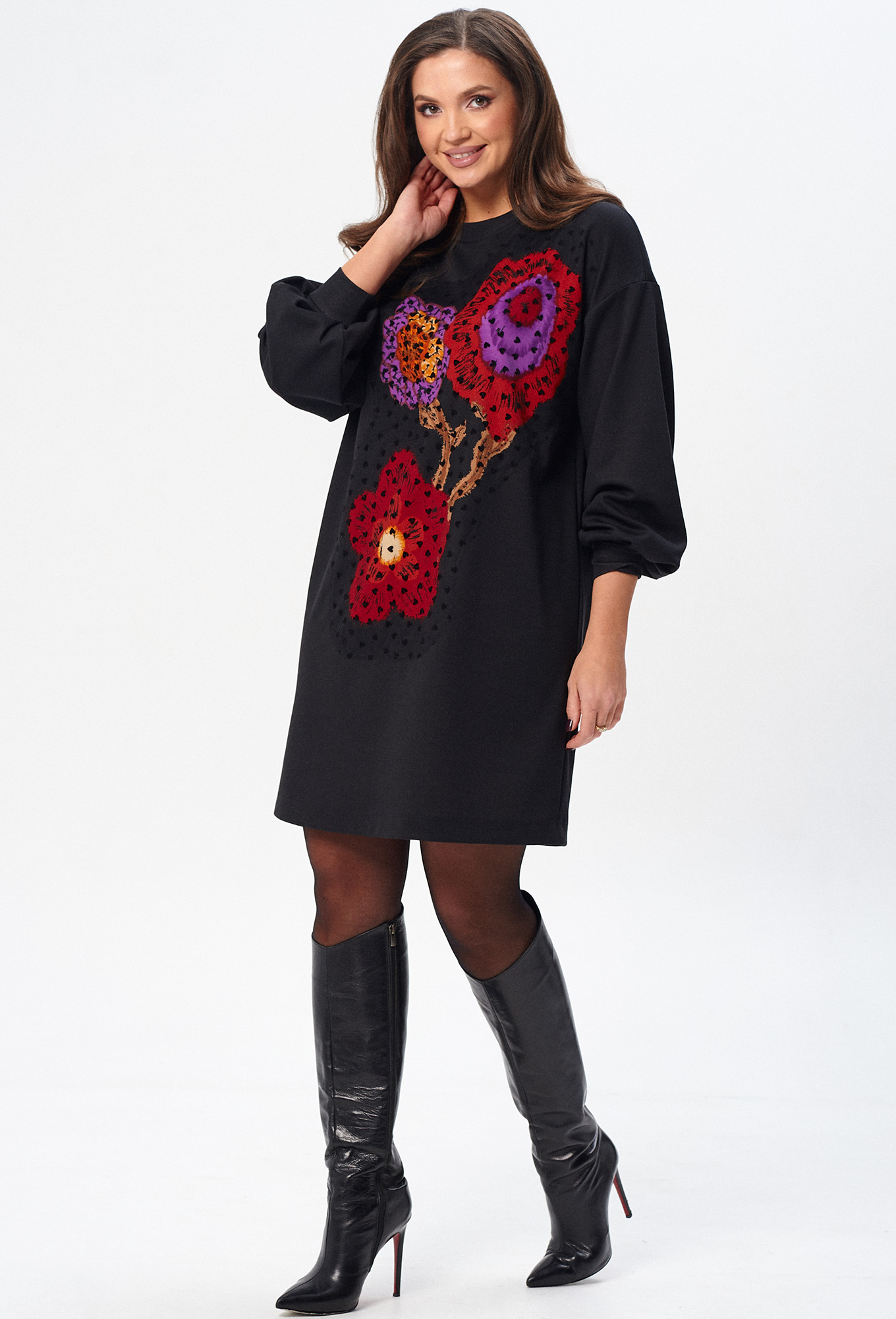 Платье (туника) свободного силуэта из трикотажной ткани с принтом. Рукав втачной одношовный со складками по низу и манжетой. Горловина обработана планкой. По переду поверх принта настрочена сетка. Сетка может быть заменена с сохранением художественного образа изделия.