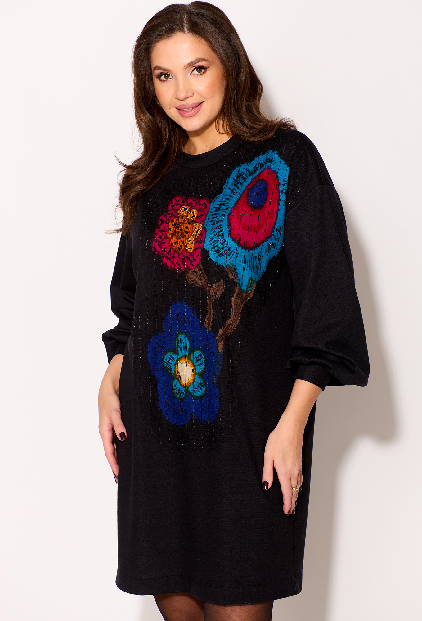 Платье (туника) свободного силуэта из трикотажной ткани с принтом. Рукав втачной одношовный со складками по низу и манжетой. Горловина обработана планкой. По переду поверх принта настрочена сетка. Сетка может быть заменена с сохранением художественного образа изделия.