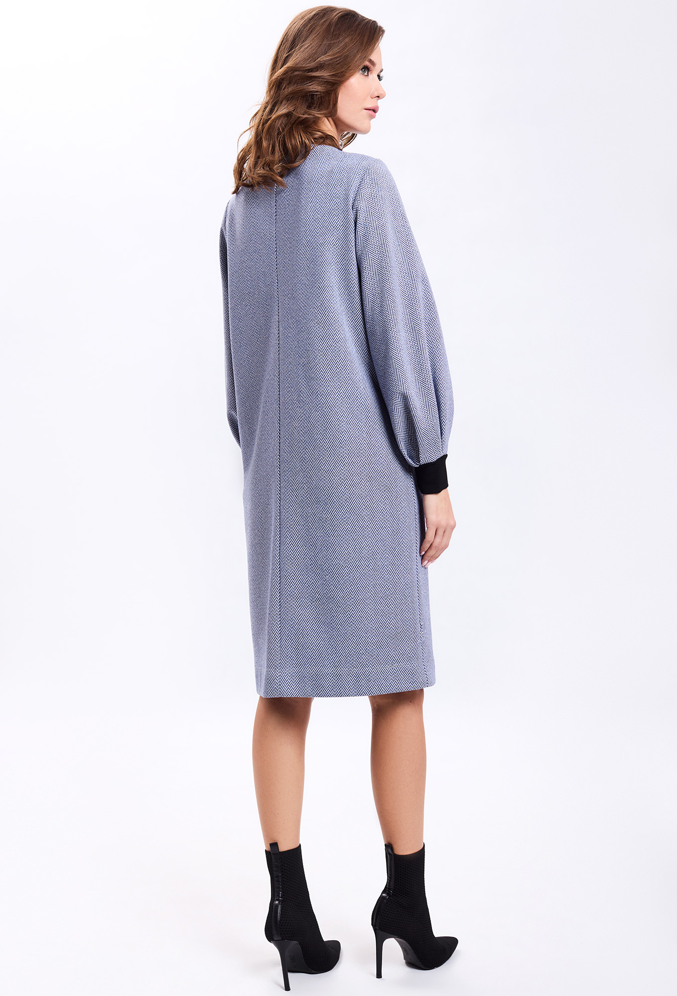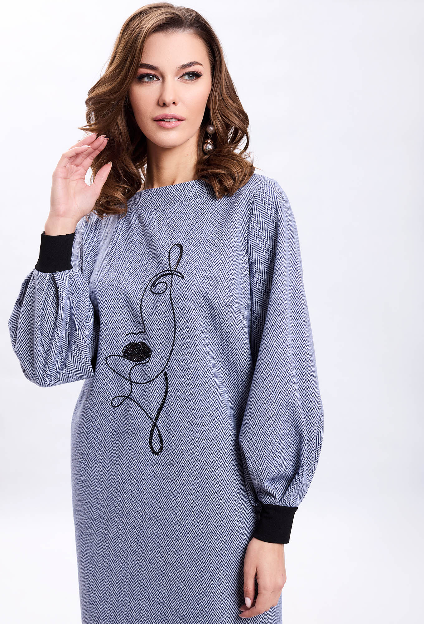 Платье прямого силуэта. Перед с нагрудными вытачками. Спинка со средним швом. Горловина лодочкой обработана планкой. Рукав одношовный втачной по низу со складками собранными на манжету-довяз. Украшением служит вышивка, расположенная по центру переда в районе груди.