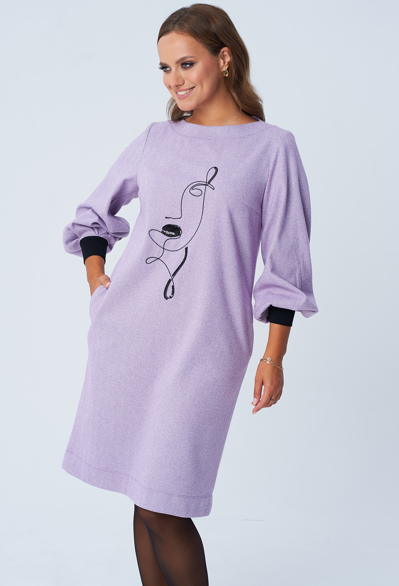 Платье прямого силуэта. Перед с нагрудными вытачками. Спинка со средним швом. Горловина лодочкой обработана планкой. Рукав одношовный втачной по низу со складками собранными на манжету-довяз. Украшением служит вышивка, расположенная по центру переда в районе груди.