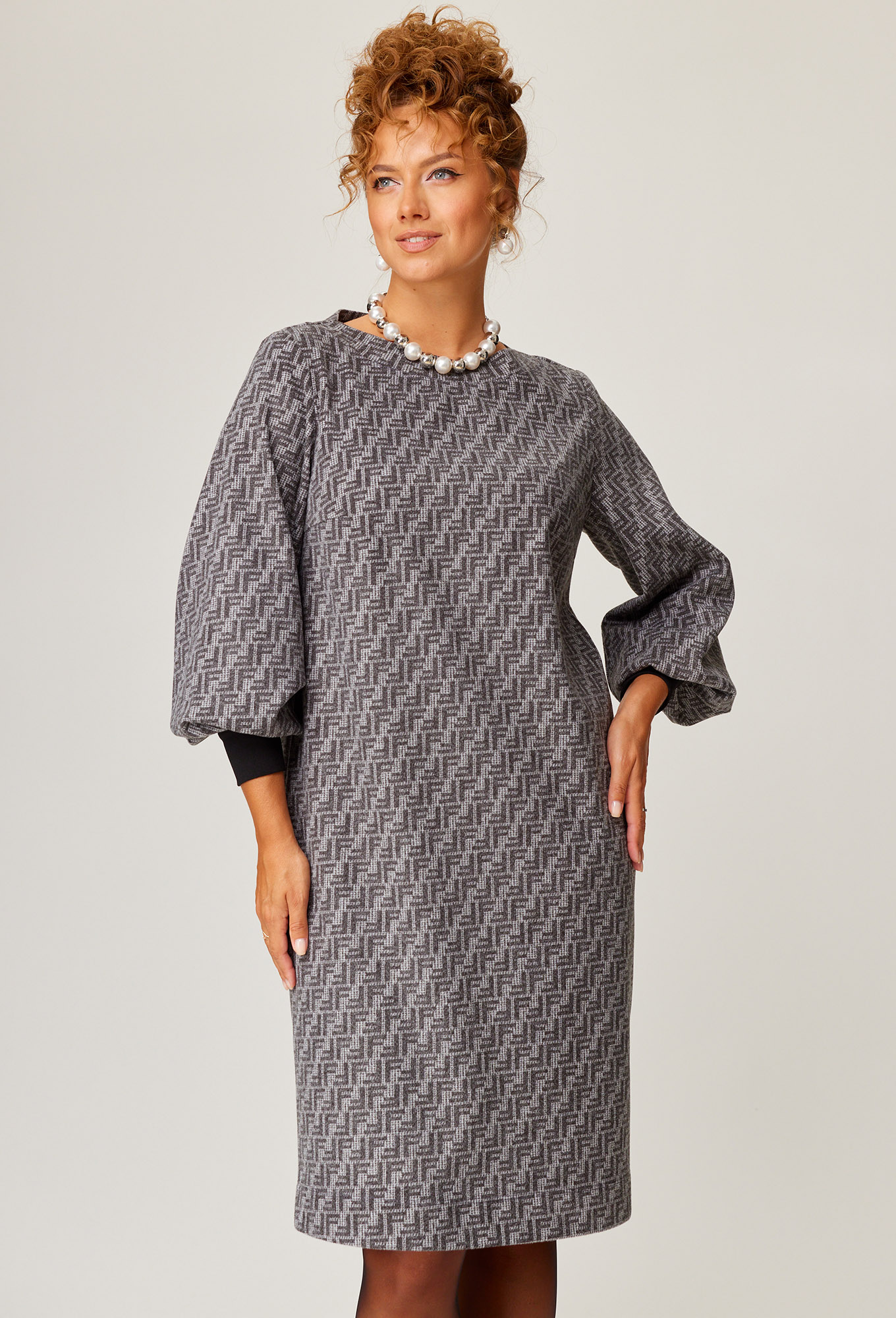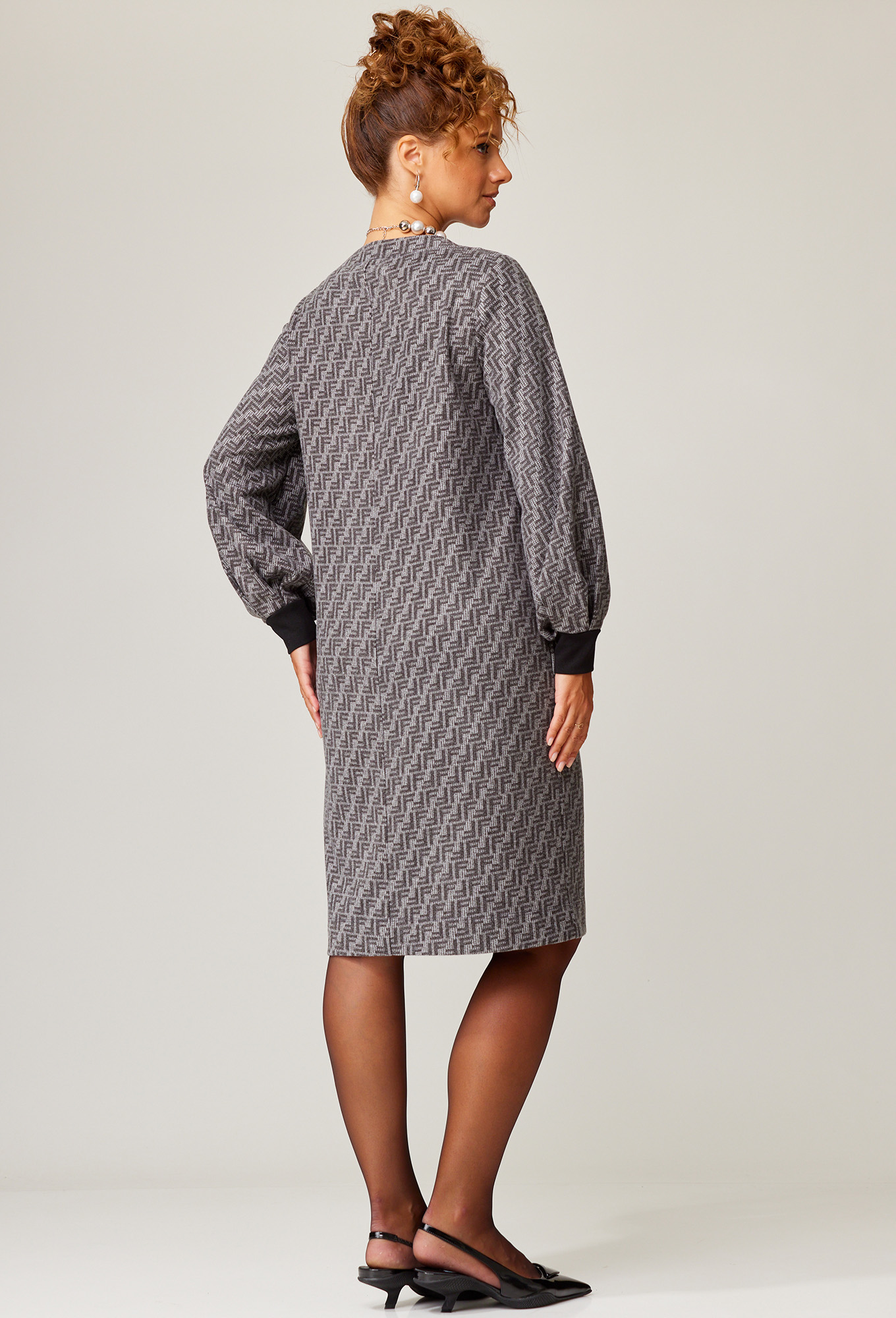 Платье прямого силуэта. Перед с нагрудными вытачками. Спинка со средним швом. Горловина лодочкой обработана планкой. Рукав одношовный втачной по низу со складками собранными на манжету- довяз.