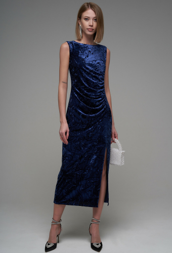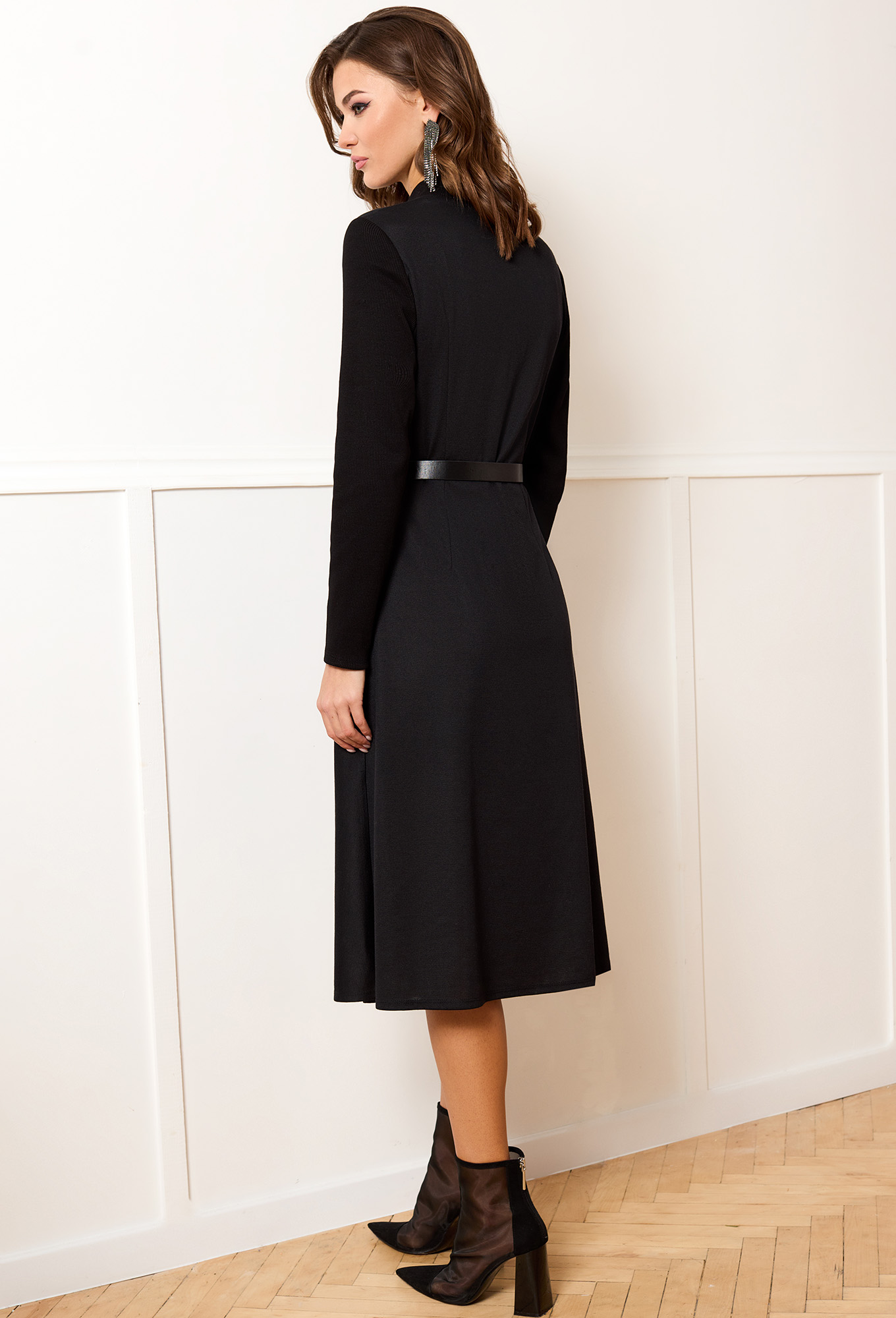 Платье полуприлегающего силуэта, отрезное по линии талии. Платье с центральной застежкой на 7 петель и пуговиц. Лиф переда с нагрудными вытачками из бокового шва. Лиф переда и спинка с талиевыми вытачками. Рукав втачной одношовный. Планки и рукава выполнены из отделочной ткани. К платью прилагается декоративный ремень. Длина по середине спинки-115см, длина рукава-59см. Фурнитура может быть изменена, сохраняя целостность художественного замысла.
