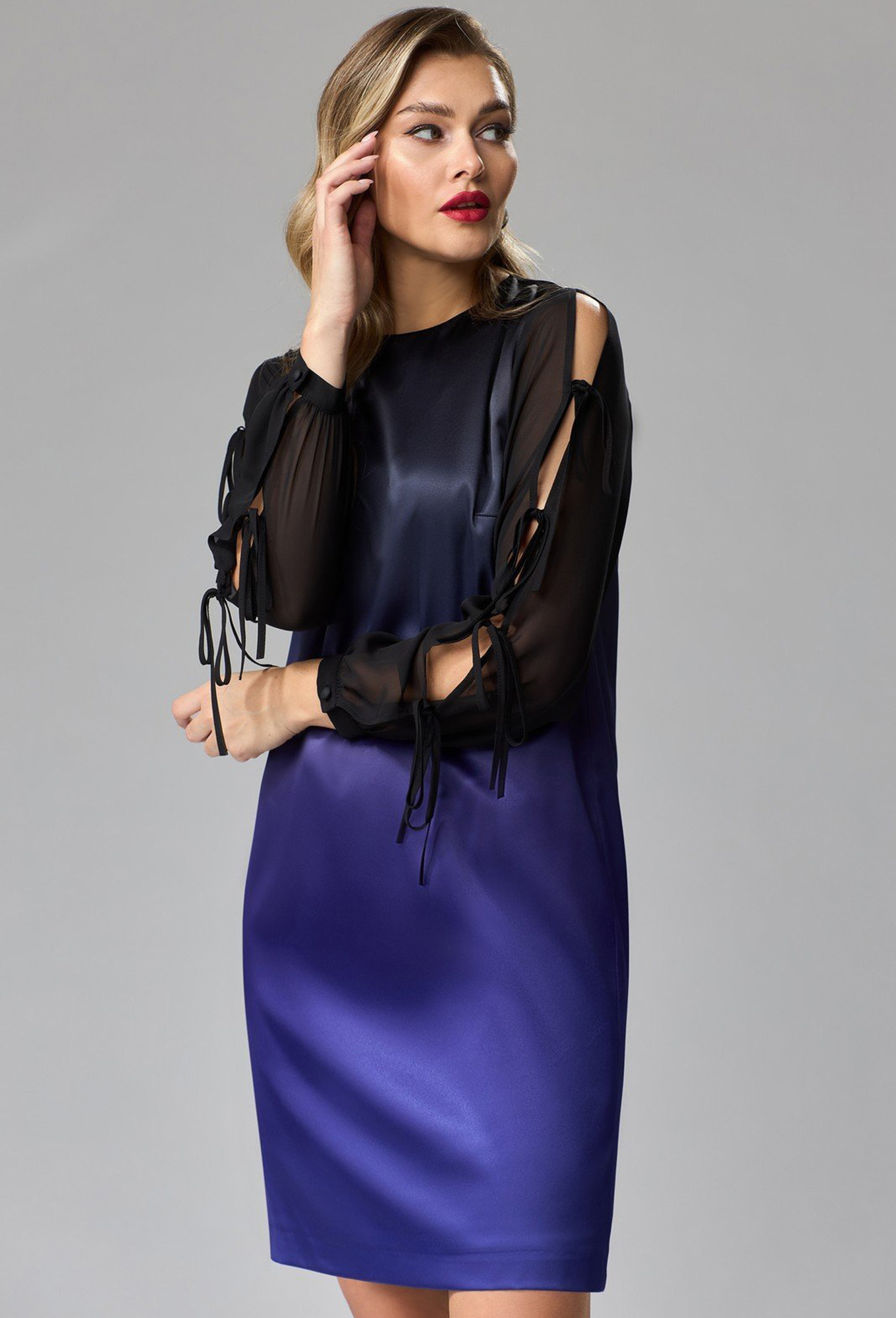 Платье прямого силуэта из атласной ткани с рисунком градиент и шифоновыми рукавами. Перед с нагрудной вытачкой. Спинка с разрезом капелькой и застежкой на пуговицу и навесную петлю. Рукав втачной с разрезом по внешнему краю и завязками из шифона. По низу рукава манжета на сборке с застежкой на одну петлю и пуговицу. Платье на подкладке.